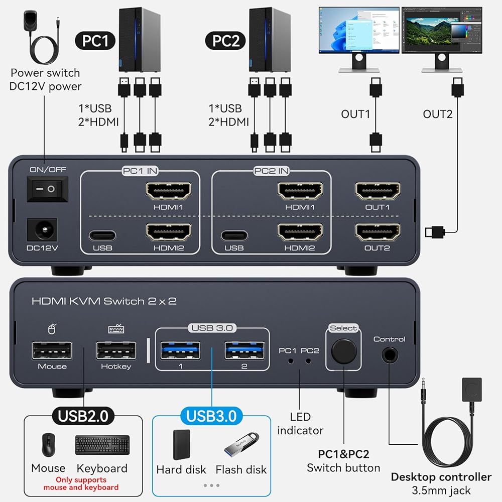 【KVM Switch 2 Monitors 2 Computers】The kvm switch dual monitor allows 2 computers or laptops to share 2 displays and 4 USB ports, such as for a mouse, keyboard, printer, hard drive, etc. It also supports extended and duplicate modes. In extended mode, you can move some application windows from the main screen to the secondary screen, improving work efficiency. In duplicate mode, the two displays will output the same screen. Note: Please ensure that your computer supports multi-screen displays and has at least 2 HDMI ports.