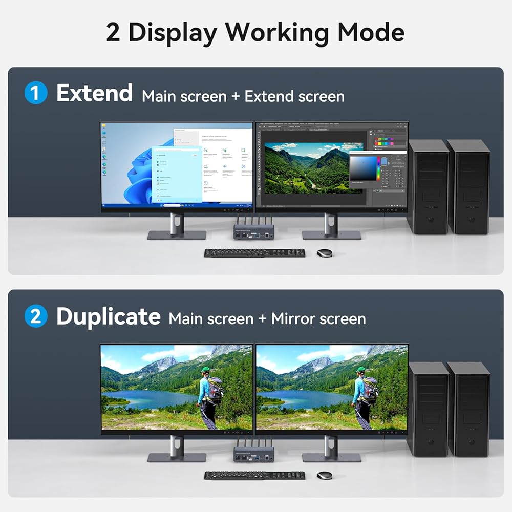 【Ultra HD 8K@60HZ】The dual monitor kvm switch supports resolutions up to 8K@60Hz and is backward compatible with 4K@120Hz, 1440P@60Hz, 3D, and 1080P@60Hz or lower resolutions. Enjoy unprecedented vibrant colors and exquisite details, and experience immersive viewing pleasure. When switching signal sources, the kvm switch 2 monitors automatically recognizes the display resolution. Note: To achieve the highest resolution, please make sure the signal source, display, and HDMI cable all support 8K@60Hz.