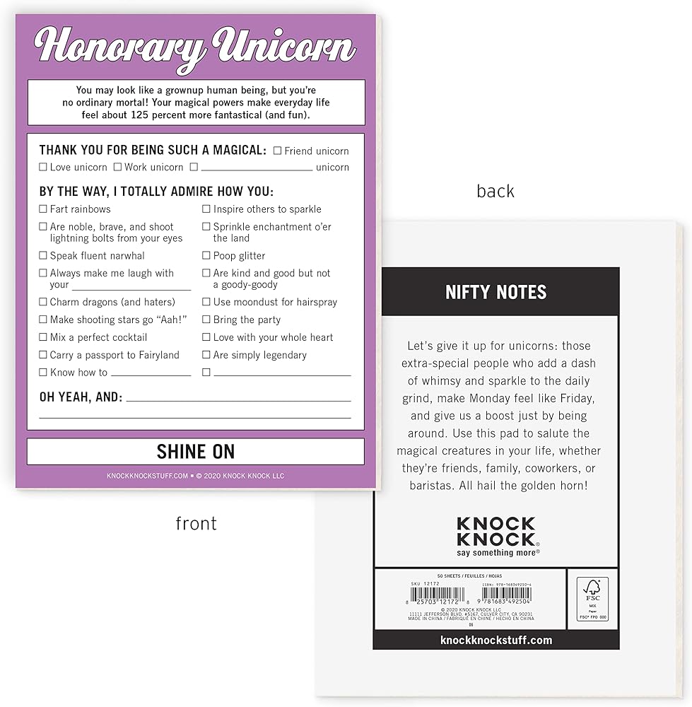 Includes: one (1) 4 x 5. 25-inch note pad, 50 sheets. Knock Knock is an independent maker of clever gifts, books, and whatever else they can think up. Their mission is to bring humor, creativity, and smarts to everyday life. Put the fun in functional with Knock Knock stuff.
