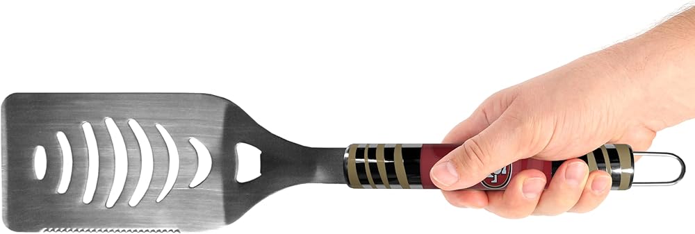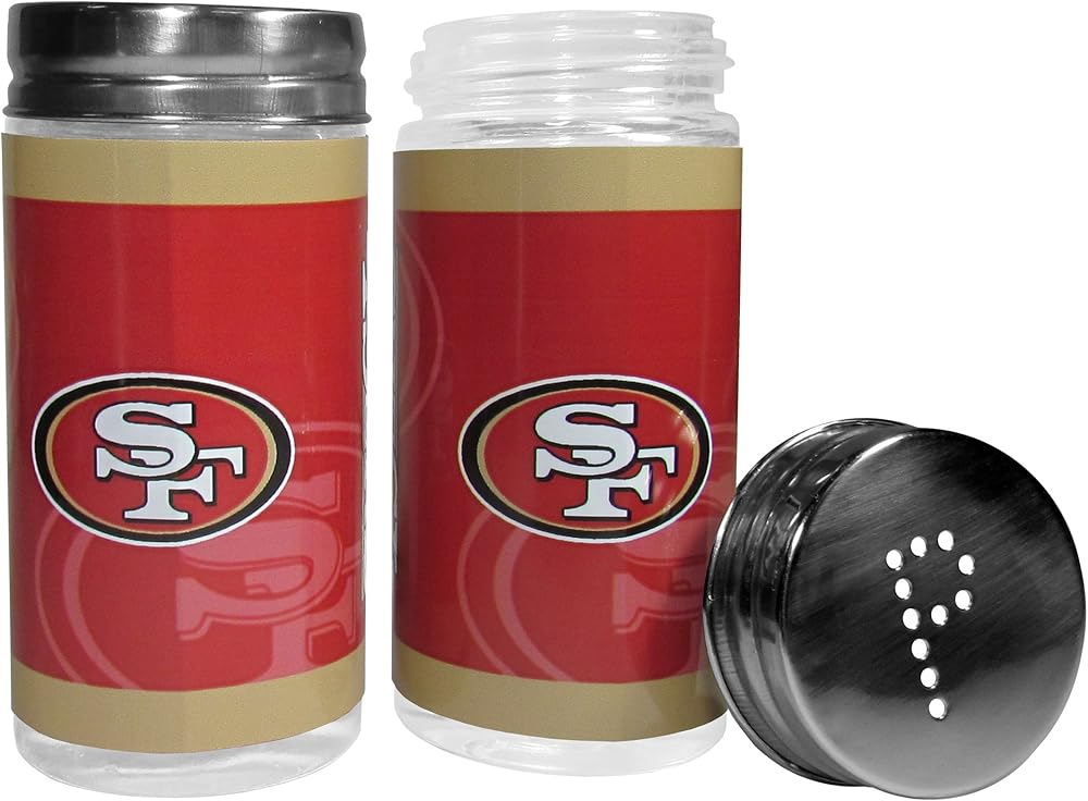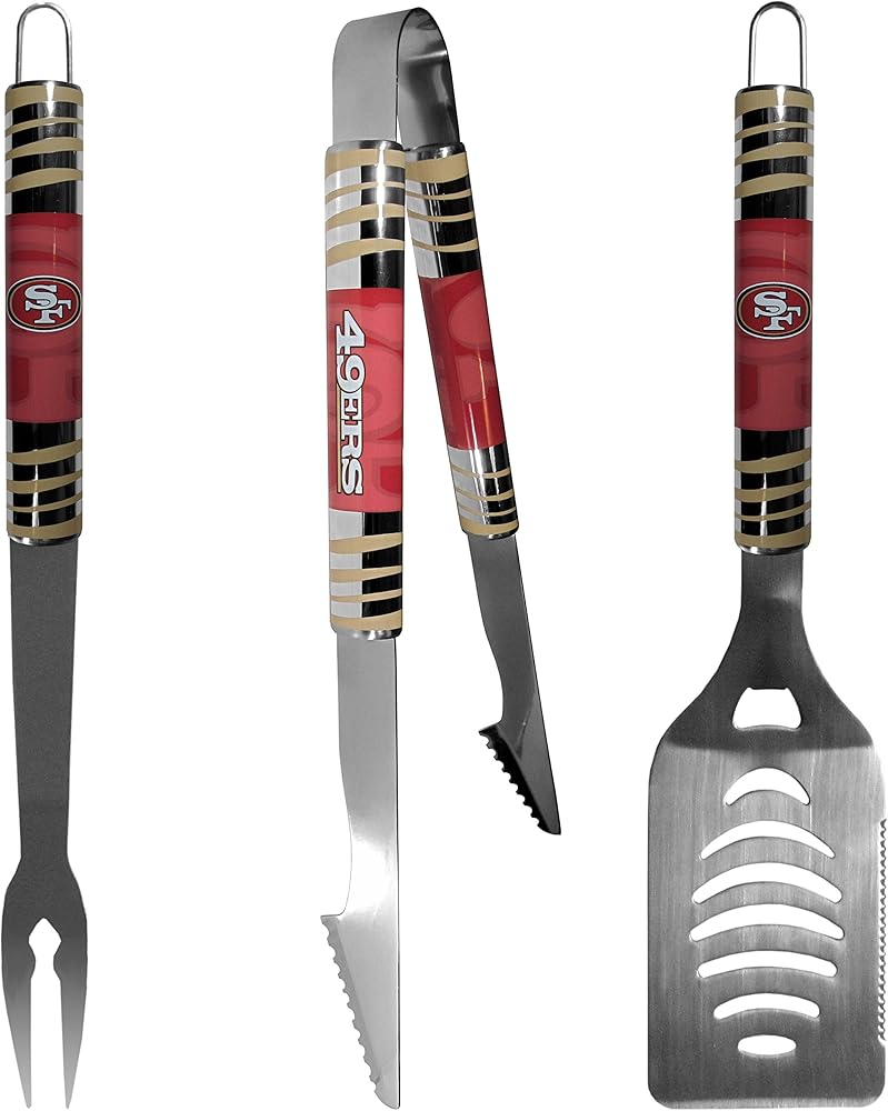 The eye-catching chrome graphics on this set make it a game day favorite! The high-quality, 420 Grade stainless Steel 3 PC San Francisco 49ers BBQ grill set will make any grill master smile. These barbeque tools are made to last and the tool set includes a large spatula with a bottle opener feature and sharp serrated edge, strong tongs and Fork. The 16 inch length keeps you far from the flames. Add in our classic salt and pepper shakers and you're ready for any game day event! The diner replica salt and pepper shakers are glass with screw top lids and team Graphics on the front.