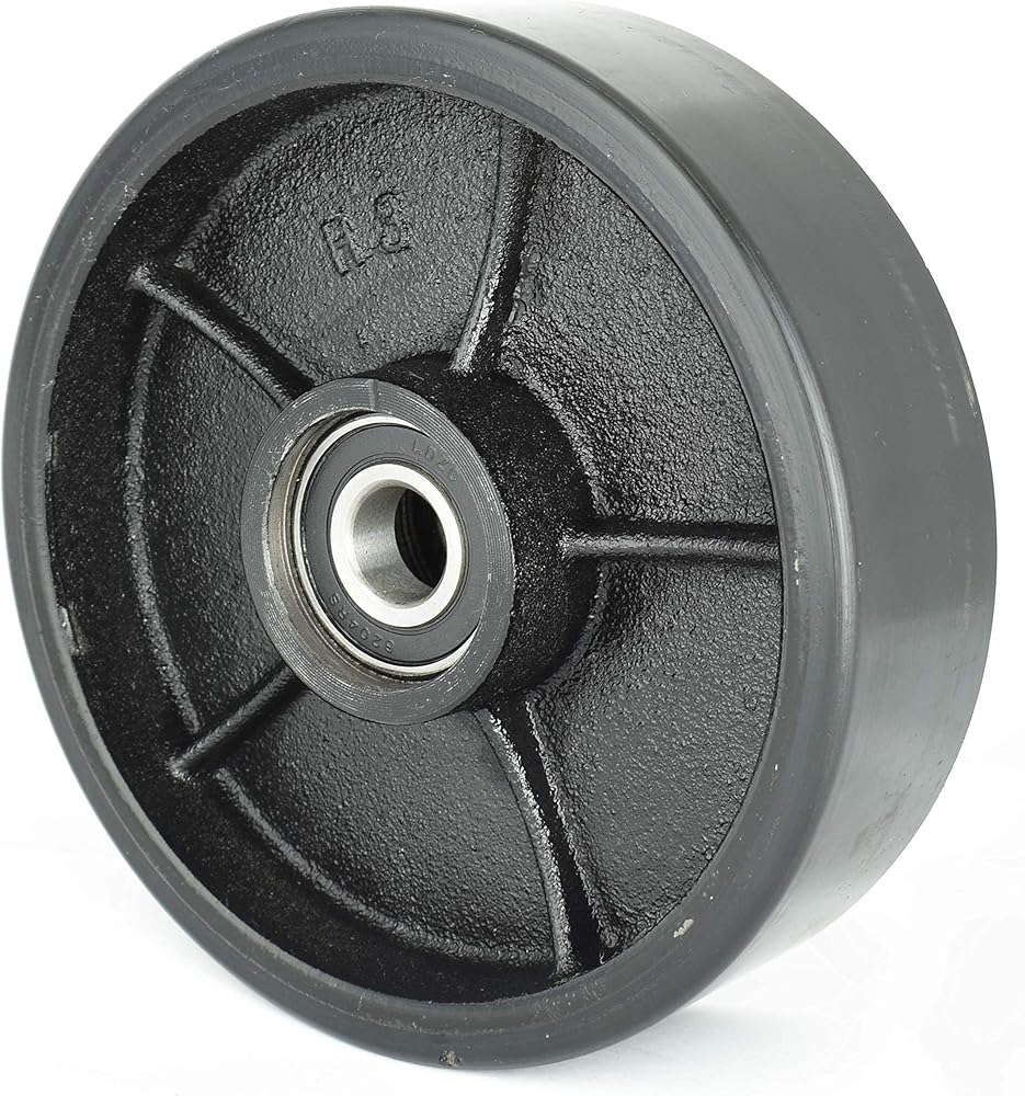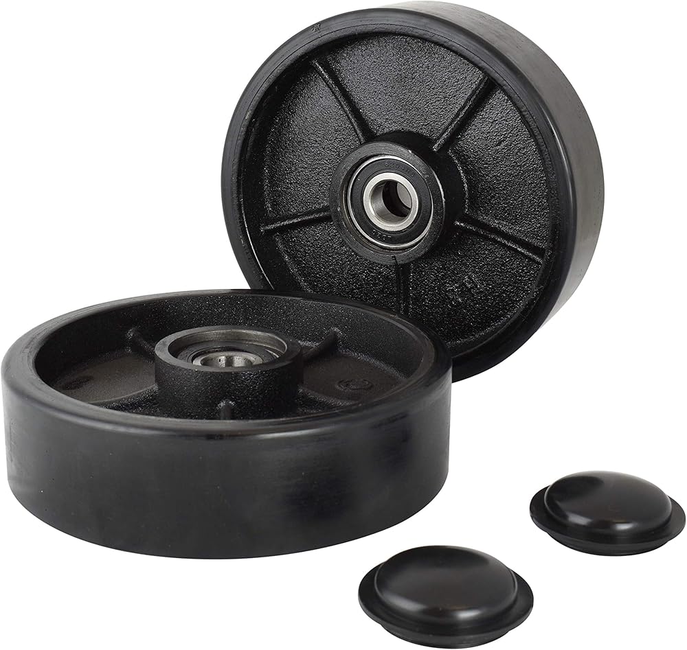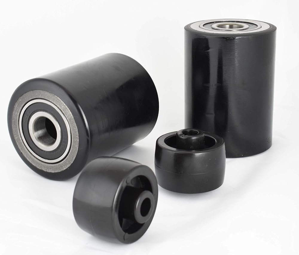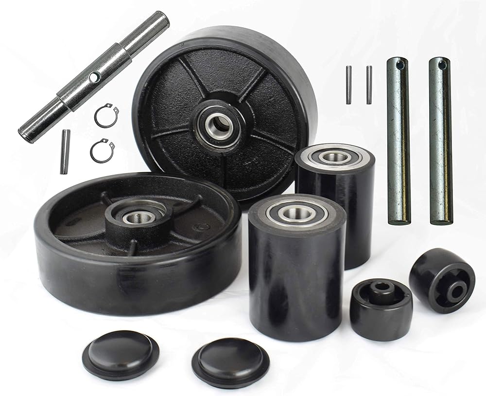 INDUSTRIAL AND HYDRAULIC IS OUR SPECIALTY, NOTHING ELSE....! Non-marring wheels leave no marking on your surfaces. Brand New Set consists of: 1 x Pair Steer Wheels for Pallet Jack Poly Tread complete with Bearings. 1 x Pair Load Wheels for Pallet Jack Poly Tread complete with Bearings. Steer Wheel Size: 7" x 2" Hub 2" with 1 x Axle and fasteners, Load Wheel Size: 2.75" x 3.75" , Bearings: 6204-2 RS 20 mm , Heavy Duty. 1 x Pair of Entry Exit Roller and Protective caps (2pcs) Generally this set fit many standard pallet jack, please check your wheel dimensions before placing your order. Quantity : 1 Set ( 2 Steer wheels + 2 Load Wheels) Material: Polyurethane on Steel. Outside to outside of the back wheel bearings is 44mm (1.73") Contact us know for any inquiry.