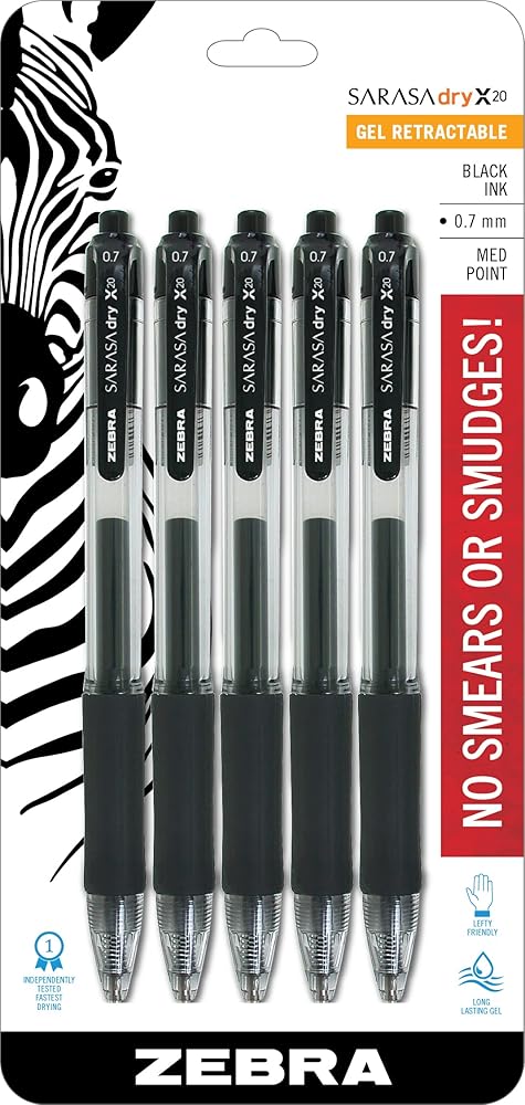 Zebra Pen Sarasa Dry X20 Retractable Gel Pen gives you the smoothness of a gel ink pen without the worries of smudges and smears. Rapid Dry Ink (RDI) Technology has been tested by a third party lab to have equal or faster dry time to industry leaders on nine common writing surfaces, making it the ultimate quick dry pen for the left handed. With its vibrant color, the 0.7mm medium point is perfect for everyday writing, document signatures and creative expression. This 2-count pack of black ink pens with transparent barrel have a latex free grip and convenient pocket clip. Impress your pen pal, up your bullet journal game or fill out your daily diary with a trusted, continually reliable writing experience. Enjoy the precision of a gel ink pen in your home and office writing without any of the drawbacks.