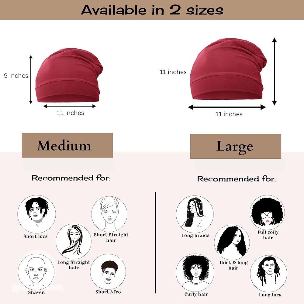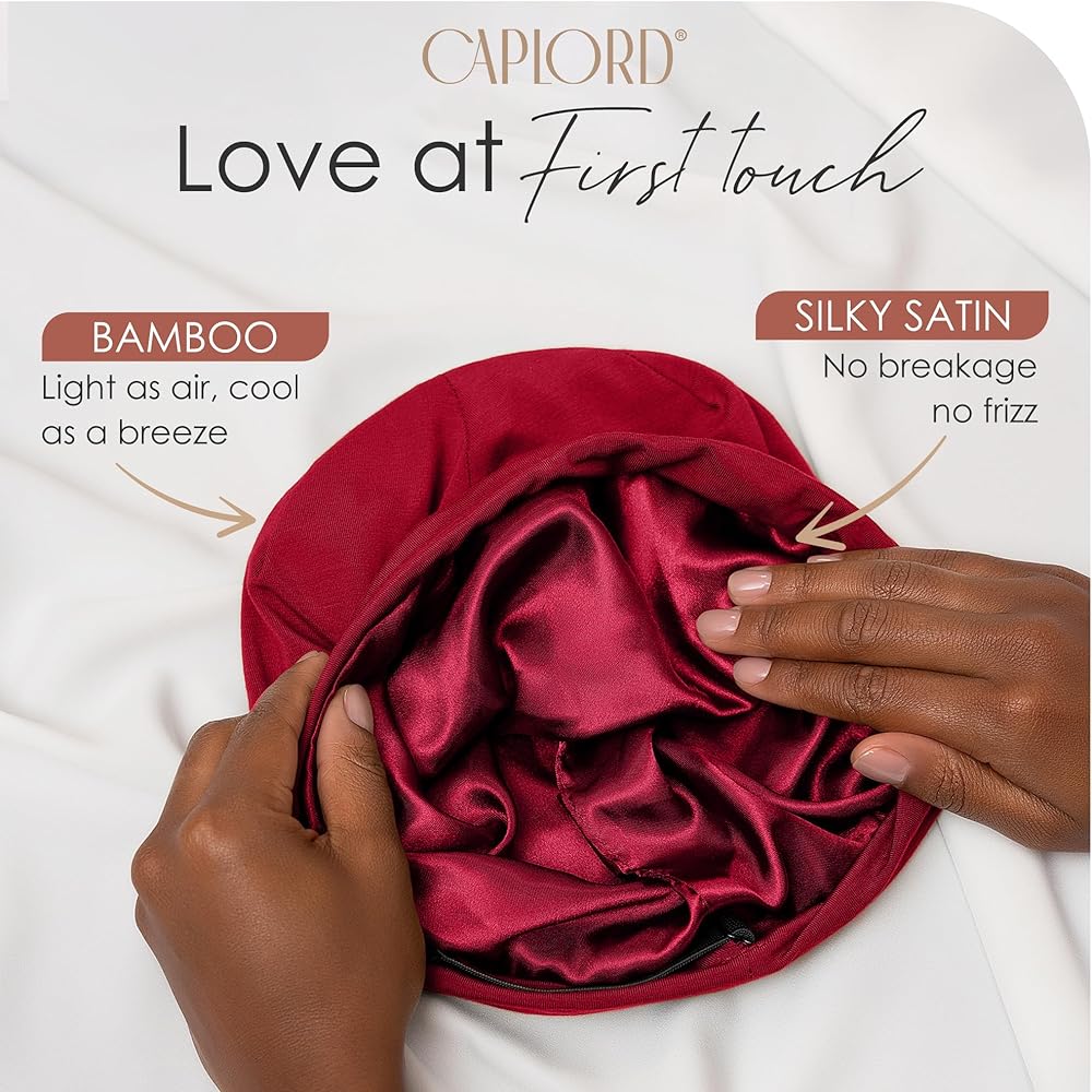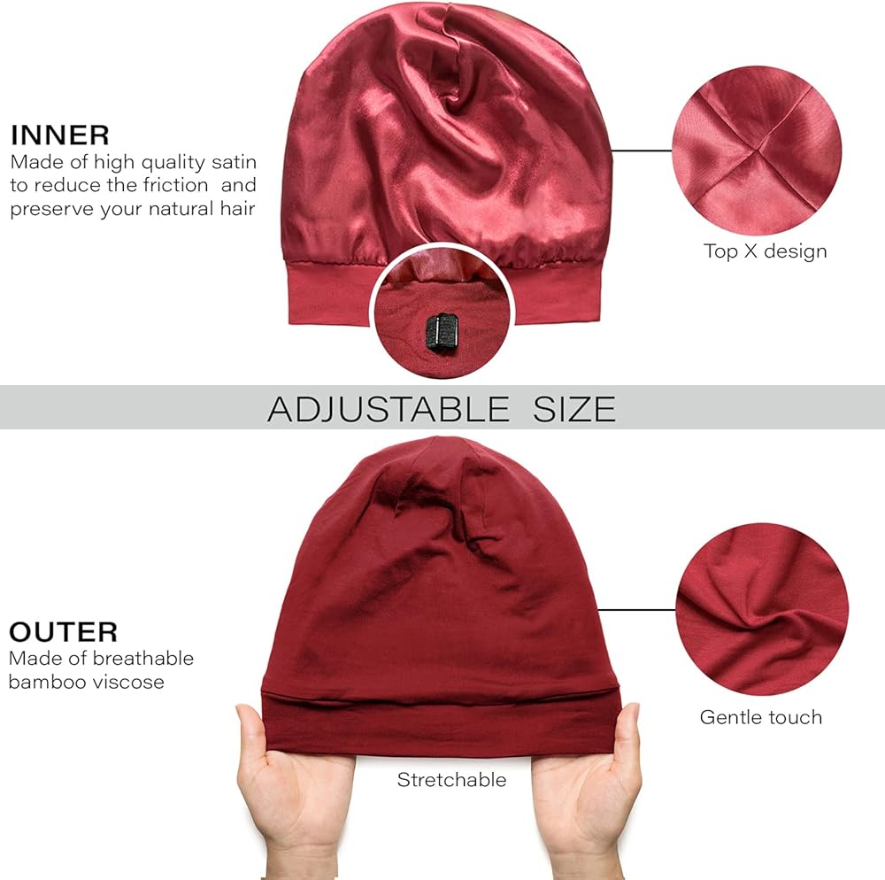 استمتع بنوم جميل: قبعة النوم الحريرية الخاصة بنا مصنوعة من الساتان عالي الجودة، فهي تقلل الاحتكاك والكهرباء الساكنة، وتمنع تلف الشعر وتحافظ على تصفيفة شعرك. استيقظي بشعر أكثر صحة ولمعانًا وسهولة في التصفيف مع قبعات النوم الفاخرة الخاصة بنا.
