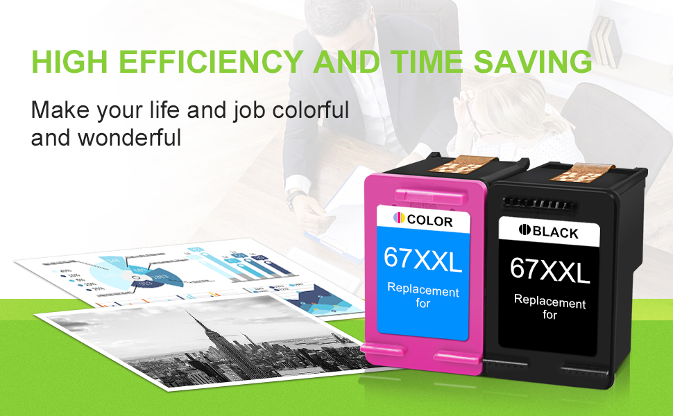 إنتاجية أعلى للصفحة: ما يصل إلى 850 صفحة لكل خرطوشة حبر سوداء 67xxl، 600 صفحة لكل خرطوشة حبر ثلاثية الألوان 67xxl بتغطية 5% (A4/letter).