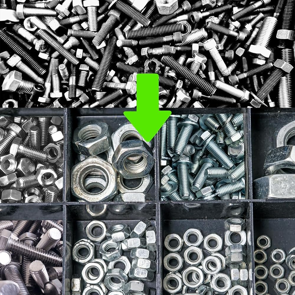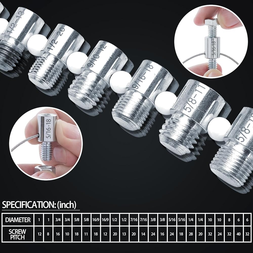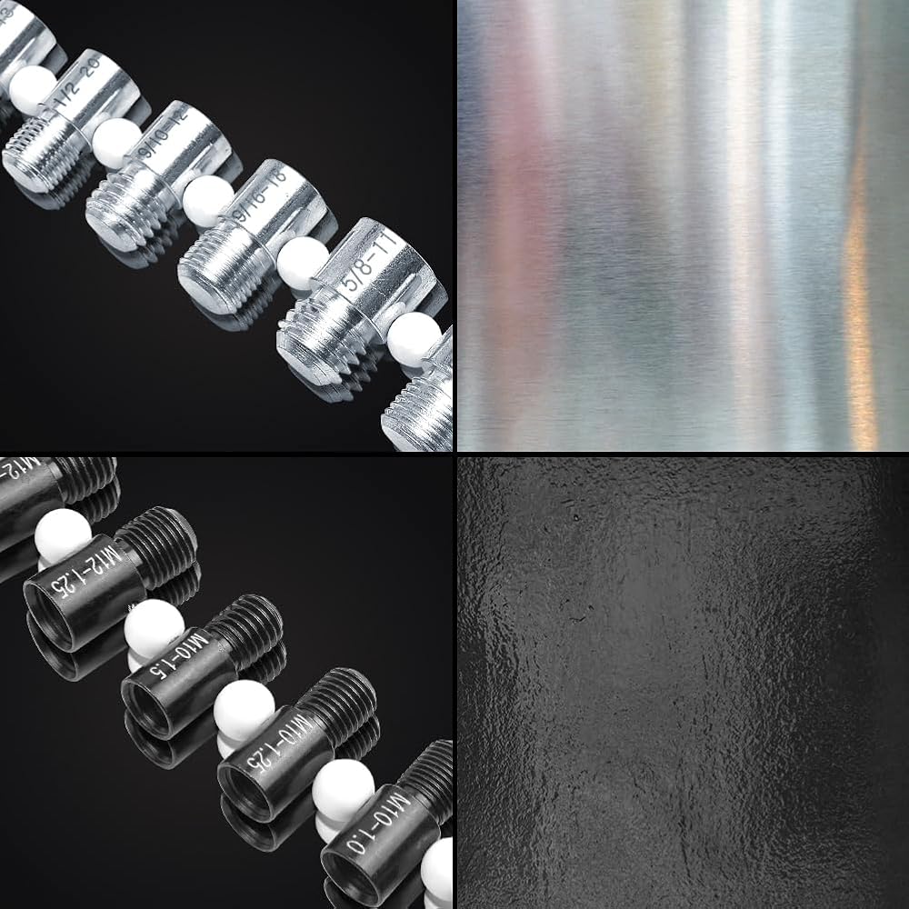 فاحص خيط الصواميل والمسمار: يتضمن مقياس خيط المسمار هذا 44 مقياسًا للذكور/الإناث - 23 بوصة و21 متريًا. يحتوي كل حجم على مدقق صامولة ومسمار على نفس المقياس. يتم نحت أحجام الخيوط بشكل دائم على كل حجم من البراغي والجوز ومقياس الخيط بعلامة مميزة.
