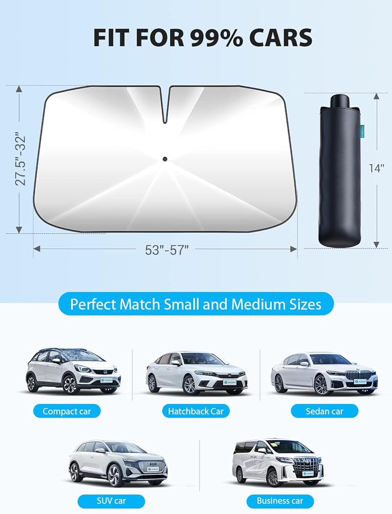 . 𝗰𝘁 𝗙𝗶𝘁 𝗳𝗼𝗿 𝟵𝟵% 𝗖𝗮𝗿】 مع العلم أن كل مركبة لها ميزاتها المميزة، ولهذا السبب اتخذنا خطوات إضافية لتعزيز توافق مظلة الشمس الخاصة بالزجاج الأمامي للسيارة. تم تجهيز المظلة الشمسية لنوافذ السيارة بتصميم فراشة حصري حاصل على براءة اختراع وتصميم تثبيت الحواف الناعمة، وتتميز بنطاق حافة قابل للتعديل 5 سم، مما يضمن أن حاجز الشمس لنافذة السيارة يمكن أن يناسب 99% من السيارات، مما يوفر ملاءمة مثالية.