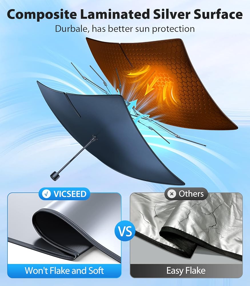 【 𝗼𝗻𝘀 𝗼𝗳 𝗨𝘀𝗲𝗿𝘀】لقد استمعنا إلى صوت عملائنا القيمين وقمنا بترقية مظلة الشمس للزجاج الأمامي للسيارة بشكل كبير. ① طلاء نانو تيتانيوم فضي على قماش تظليل من الفينيل لمقاومة أفضل للحرارة دون التجعد ② حواف تثبيت ناعمة حاصلة على براءة اختراع مصممة لتوافق أوسع ③ ألياف زجاجية قوية وغير قابلة للكسر خالية من الصدأ لعمر أطول ④ بطانة عازلة للحرارة متعددة الطبقات للحصول على ظلة أفضل