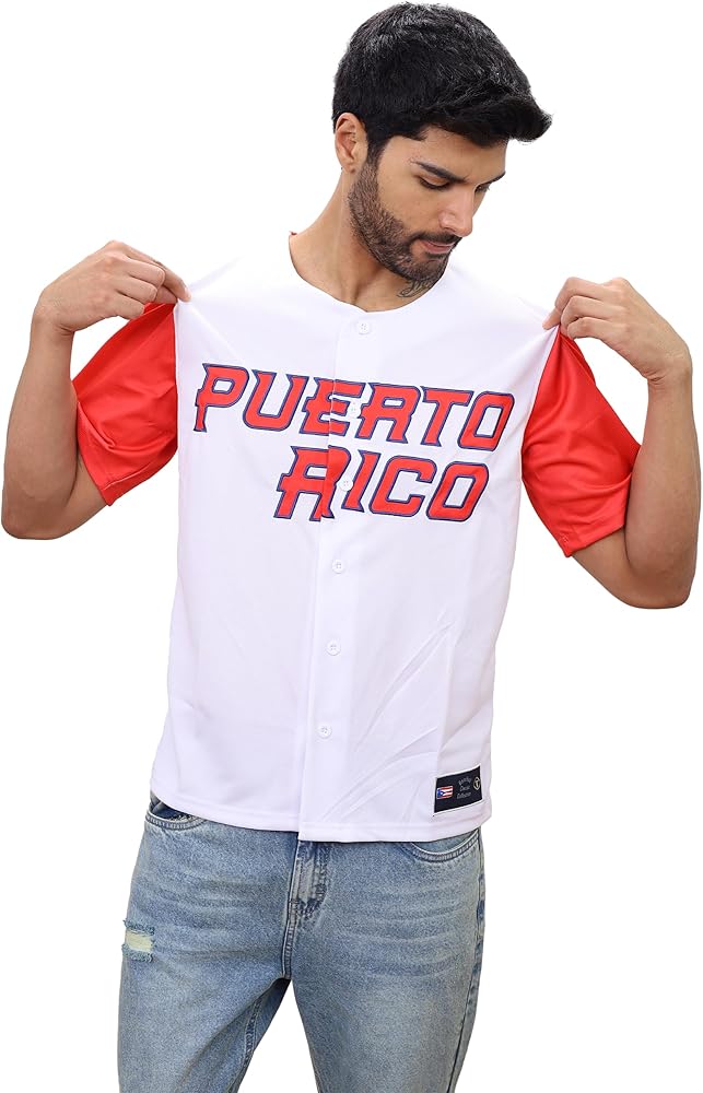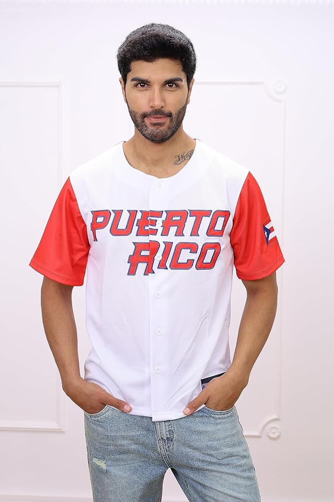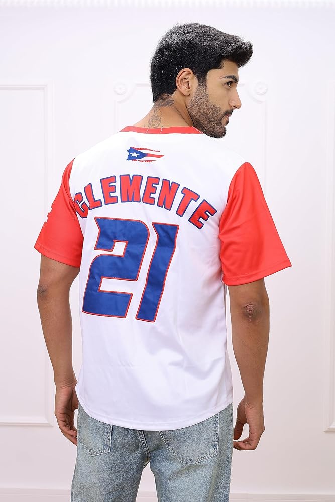 Puerto Rico Classic Baseball Jersey. Meticulously crafted to celebrate the legendary Roberto Clemente, this iconic jersey features the revered number 21 in exquisite embroidery, making it a must-have for fans and fashion aficionados alike. Designed with a harmonious blend of white and red, this jersey epitomizes classic baseball aesthetics while offering a fresh, modern vibe. Whether you're cheering from the stands, reliving history, or simply seeking a unique addition to your casual wardrobe, this jersey stands out. Its exclusive design, high-quality materials, and attention to detail make it not just a piece of sportswear, but a tribute to a hero of the game