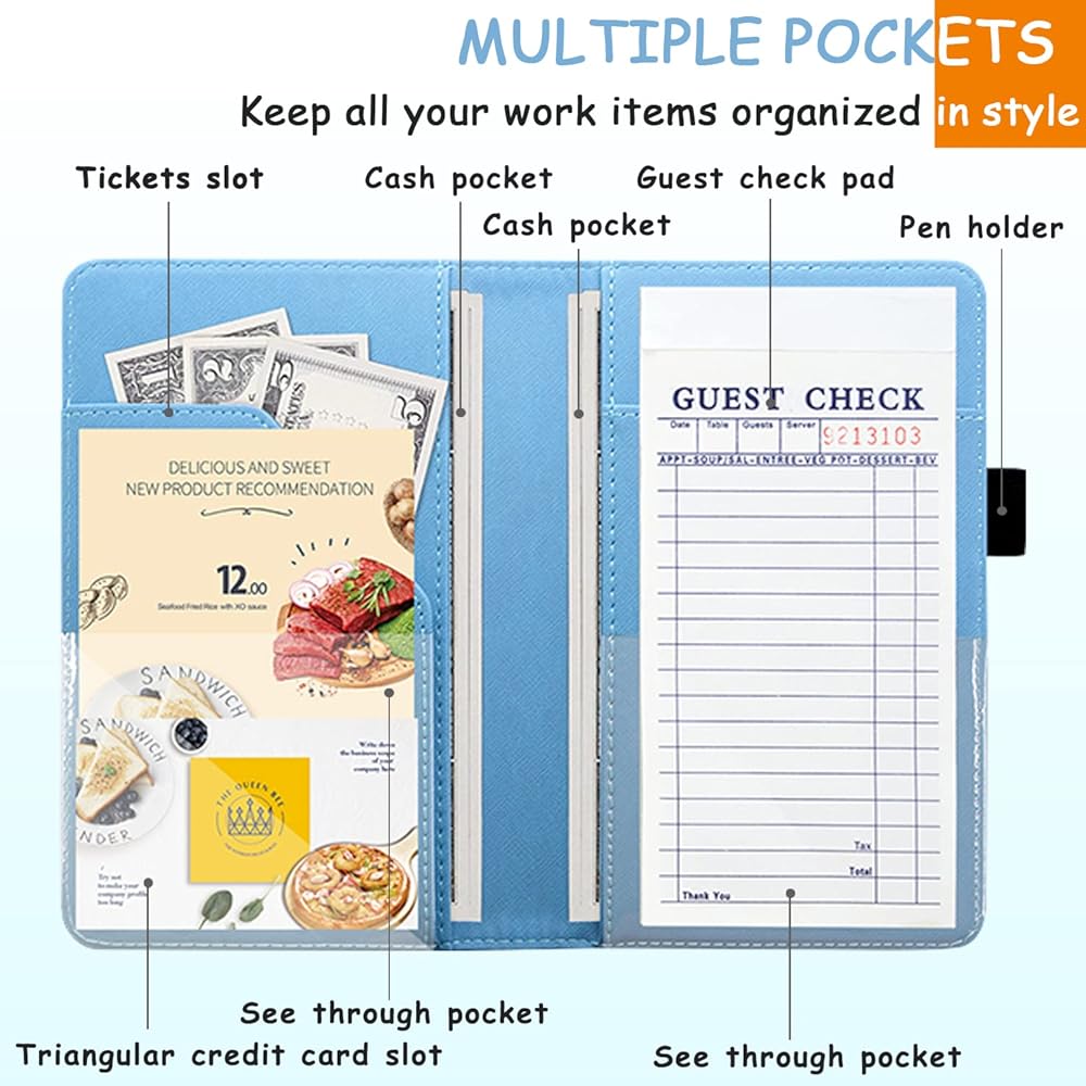 • ⭐ تصميم عملي: يحتوي كتاب النادلة هذا على جيوب ومقصورات متعددة لحمل وسادات الطلبات وشيكات الضيوف العادية والإيصالات وبطاقات الائتمان والنقود والقلم وما إلى ذلك. سوف يلبي احتياجاتك في العمل بشكل مثالي.