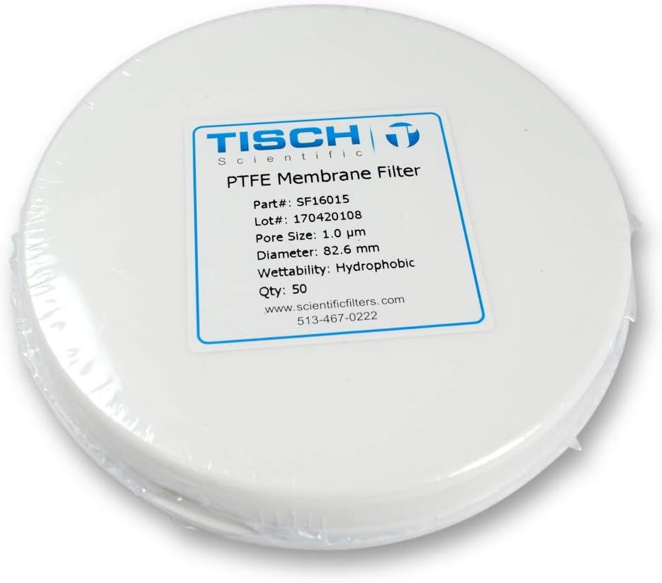 Tisch Brand SF14621 PTFE Polytetrafluoroethylene Membrane Filter, 1.0um, 82.6mm, 1/pk/50 per pack | Wettability: Hydrophobic | Maximum Operating Temperature: 130 Degrees C |