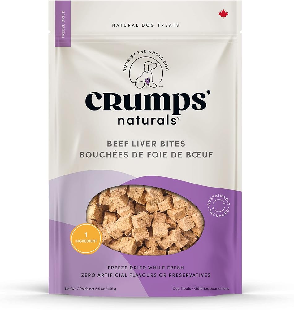 Our Beef Liver Bites are made from 100% Canadian Beef Liver. We start with federally inspected Canadian beef, cut it into bite-size cubes and freeze-dry it for optimum flavor and freshness. Dogs love his treat because of the delicious aroma from the freeze-dried beef liver. Packed full of flavor, this treat is perfect for treating or training. Perfect for all dogs, however the soft texture makes this treat an excellent option for older and/or small breeds. This treat is all natural, grain-free, gluten-free, single-ingredient and high in protein. Also, makes for an ideal complement to a raw food diet. Beef Liver Bites are tasty meaty treat for all dogs. Made with care in our kitchen in small batches. Every Crumps' Naturals Treats encourages better pet health with all-natural healthy ingredients to aid in digestion, vitamin absorption, decrease allergy issues, promote vibrant skin and coat, promote healthy gums and teeth and a healthy immune system. No additives. No Preservatives. No Colours. 100% Beef Liver.