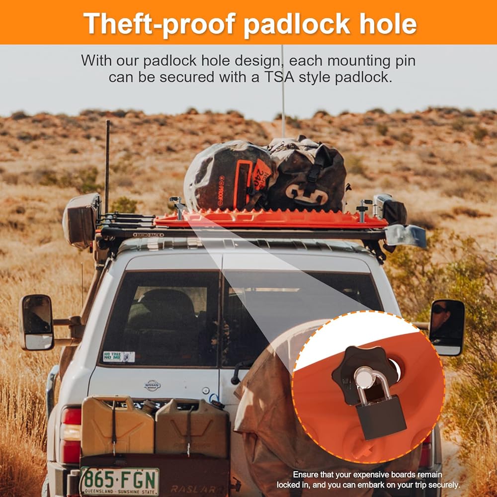 【 تصميم فتحة القفل لمقاومة السرقة 】 تعتبر لوحات الجر/الاسترداد هذه ضرورية لأي طريق وعرة، ولكن تركها على رف السقف يمكن أن يؤدي إلى سقوطها بسبب الطرق الوعرة أو التعرض للسرقة. إن وضعها داخل السيارة يشغل مساحة كبيرة. ومع ذلك، مع تصميم فتحة القفل، يمكن تأمين كل دبوس تثبيت بقفل من طراز TSA. سيضمن ذلك بقاء لوحاتك الباهظة الثمن مغلقة، ويمكنك البدء في رحلتك بأمان.
