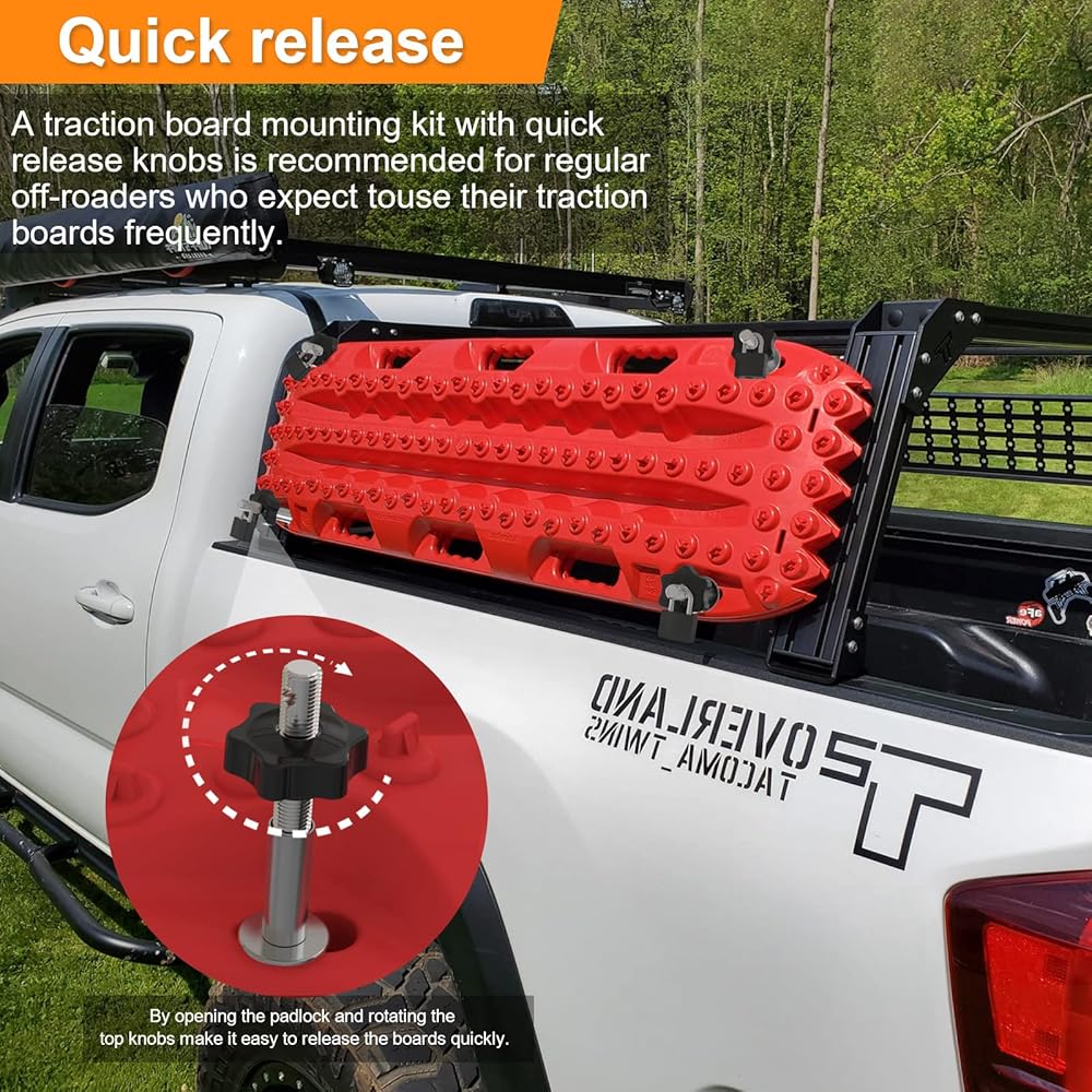 【 إصدار سريع 】 يوصى باستخدام مجموعة تركيب لوحة الجر مع مقابض سريعة التحرير للطرق الوعرة العادية الذين يتوقعون استخدام لوحات الجر الخاصة بهم بشكل متكرر. تسمح هذه المجموعة المريحة والموفرة للوقت بالوصول بسهولة إلى لوحات الجر دون الحاجة إلى أدوات. من خلال فتح القفل وتدوير المقابض العلوية يجعل من السهل تحرير الألواح بسرعة، في حين أن التصميم القوي سهل التركيب ويأخذ مساحة صغيرة في سيارتك.