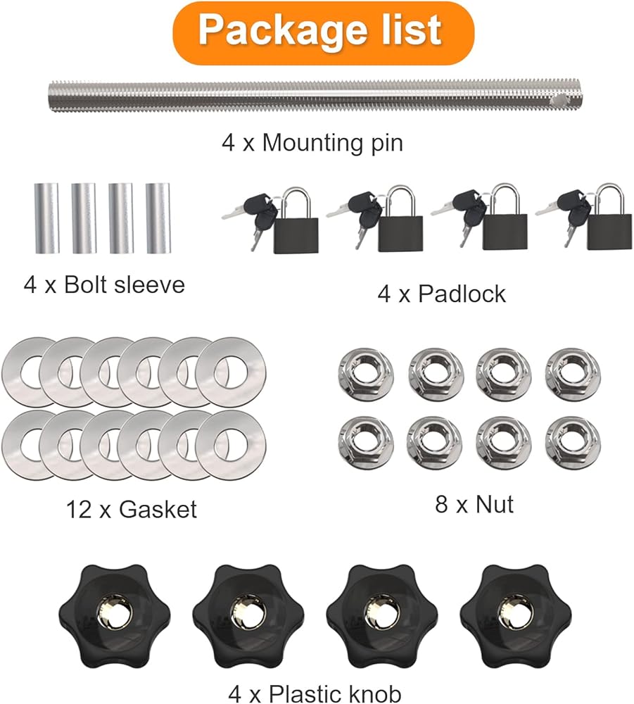 【 تتضمن العبوة وضمان الجودة 】 تحتوي مجموعة تثبيت لوحة الجر على 4 مقابض بلاستيكية، و4 دبابيس تثبيت، و4 أكمام مسامير، و4 أقفال، و8 صواميل، و12 حشية، وتأتي مع دليل التعليمات. (ملاحظة: دعامات التثبيت غير متضمنة.) نقدم ضمانًا لمدة عام كضمان للجودة، إذا كان لديك أي سؤال فلا تتردد في الاتصال بنا، وسوف نقوم بالرد عليك بالحل المناسب في غضون 24 ساعة.