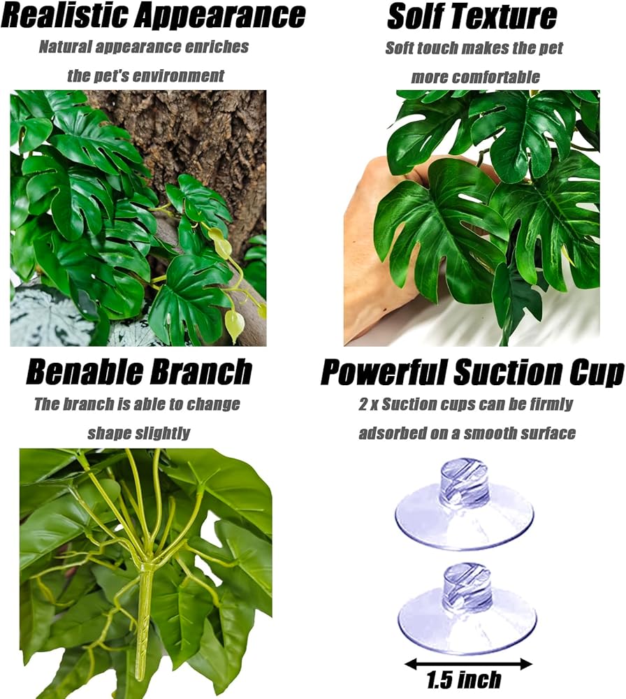 【تشمل العبوة】تحتوي العبوة على ورقتين معلقتين لديكور نباتات الزواحف، مع 4 أكواب شفط. مثالية لديكورات موائل الزواحف، وتعليق حوض السباحة، وديكورات حوض الثعبان.