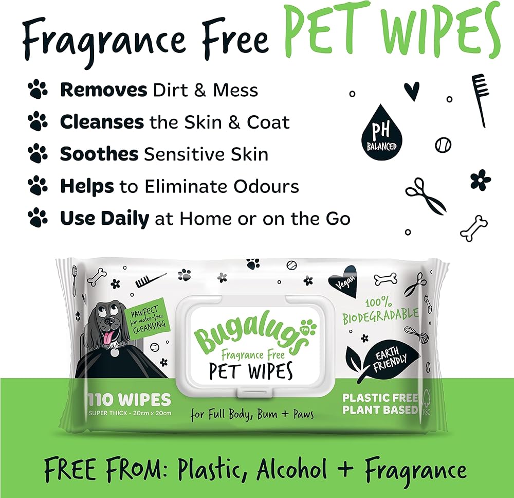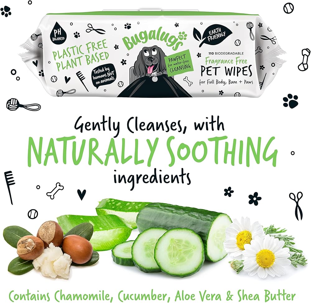 No bath, more play! Bugalugs Biodegradable fragrance-free dog wipes are enriched with a natural formula utilising the soothing and cleansing benefits of chamomile, cucumber, aloe vera, shea butter and vitamin E for a gentle cleanse. Multipurpose use as dog wipes for bums, dog ear cleaner wipes, dog wipes for smelly dogs, cat eye wipes or dog face wipes.