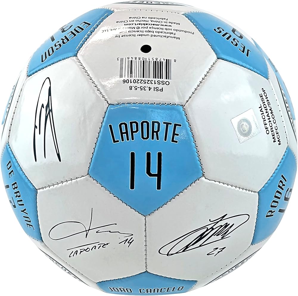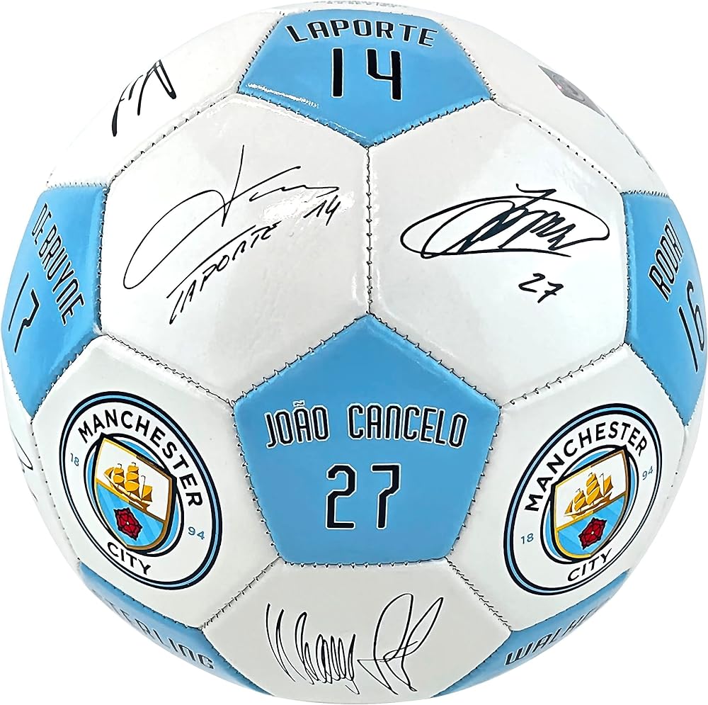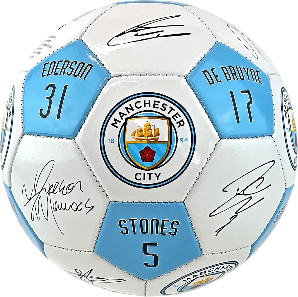 MANCHESTER CITY FC PLAYER SIGNATURES SOCCER BALL - SIZE 5 - Show off your Man City pride with the official Manchester City Size 5 Soccer Ball featuring the club's crest and the numbers and signatures of legendary players, making it a great choice for memorabilia collections. This soccer ball is perfect to display as a collectible, but durable enough for practice or gametime. The ball arrives deflated and requires a pump for inflation.