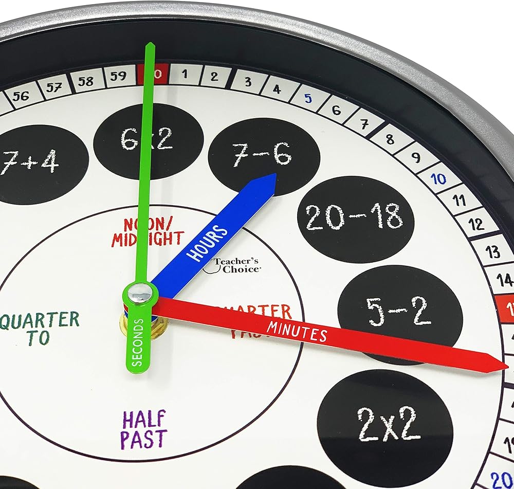 يمكن للأطفال أن يتعلموا بسهولة مصطلحات مثل الربع الماضي والنصف الماضي والربع. يتم وضع علامة على الساعات والدقائق وعقارب الثواني.