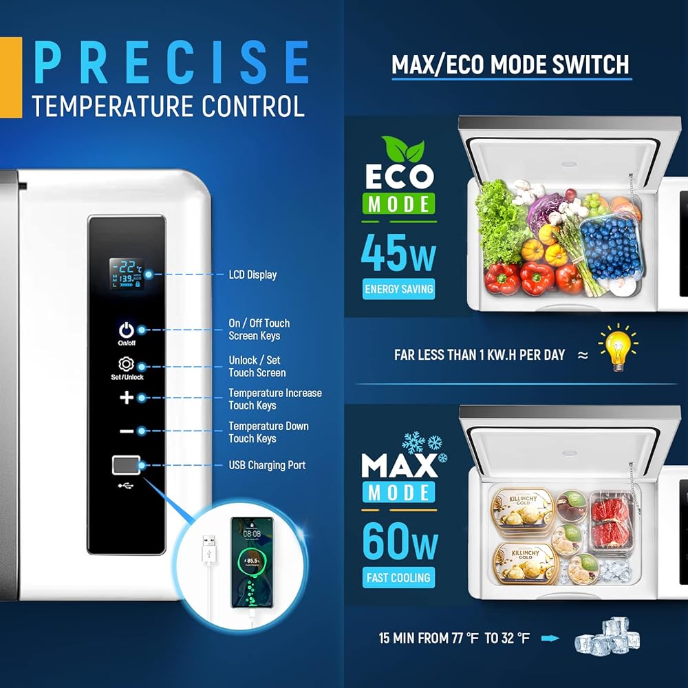 وضع التبريد الأقصى/الاقتصادي وحماية بطارية السيارة. يمكن ضبط ثلاجة السيارة AA على الوضع MAX (التبريد السريع) والوضع الاقتصادي (توفير الطاقة). تحتوي الثلاجات 12 فولت على وظيفة ذاكرة درجة الحرارة و3 مستويات مختلفة لحماية البطارية: حماية البطارية ثلاثية المستويات H/M/L يمكن أن تحمي بطارية سيارتك من التصريف. كما تأتي لوحة شاشة LCD مع منفذ شحن USB، يمكنك شحن هاتفك عند الاحتياج.