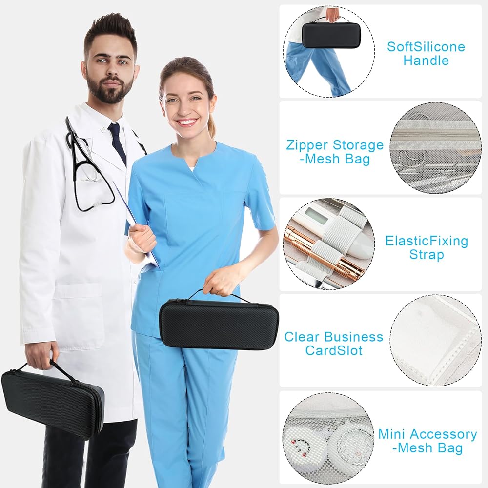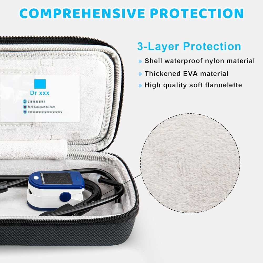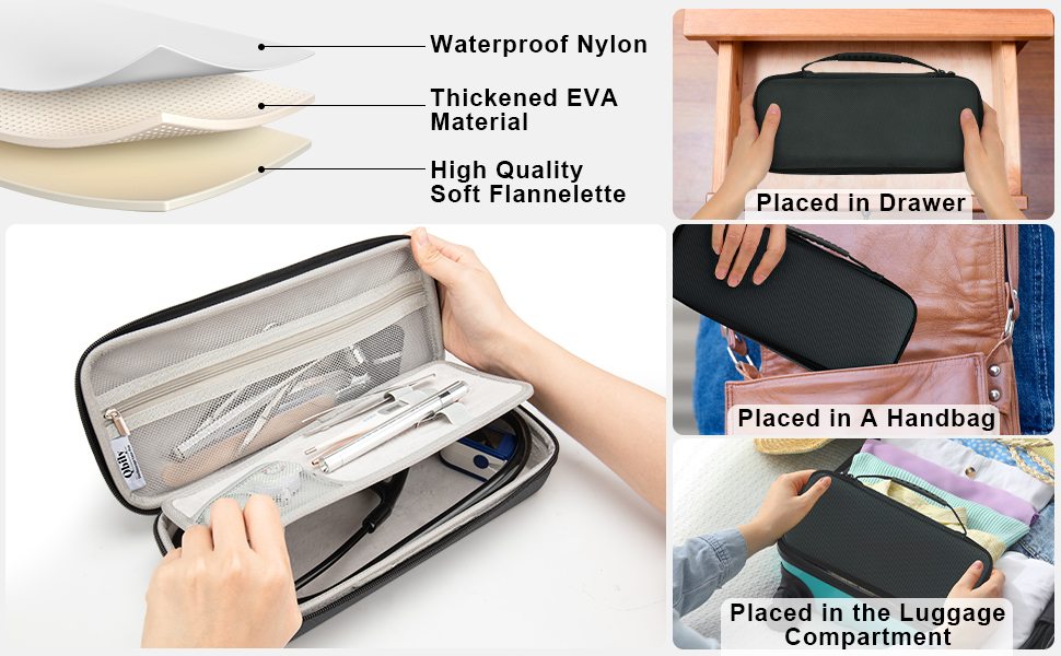 ★ داخلي وخارجي: الغلاف مصنوع من مادة EVA الصلبة والنايلون، وهي متينة ومقاومة للتمزق ومثبطات اللهب ومقاومة للماء والصدمات. يمكن للطبقة البينية الناعمة والبطانة المخملية الناعمة أن تخفف من قوة التأثير المتولدة أثناء الاصطدام، وتقلل من الأضرار الناجمة عن الاصطدام وتضمن سلامة سماعة الطبيب والملحقات الداخلية.