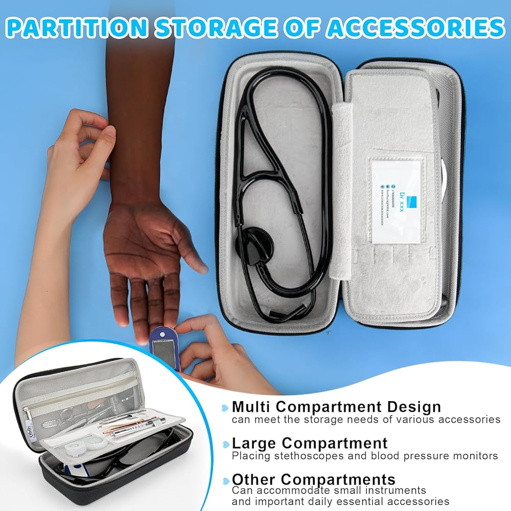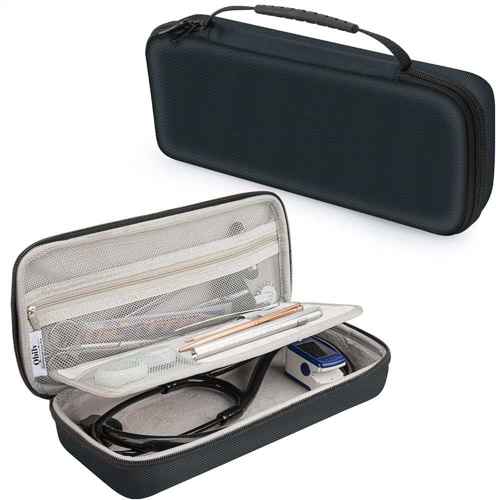 حقيبة حمل سماعة الطبيب الصلبة الكبيرة باللون الأزرق الداكن مع فتحة لبطاقة الهوية، حقيبة سماعة طبية من نسيج قطني طويل مقاومة للماء والصدمات متوافقة مع جميع سماعات الطبيب Littmann/ADC/Omron/MDF/Dixie EMS وملحقاتها (الجراب فقط)