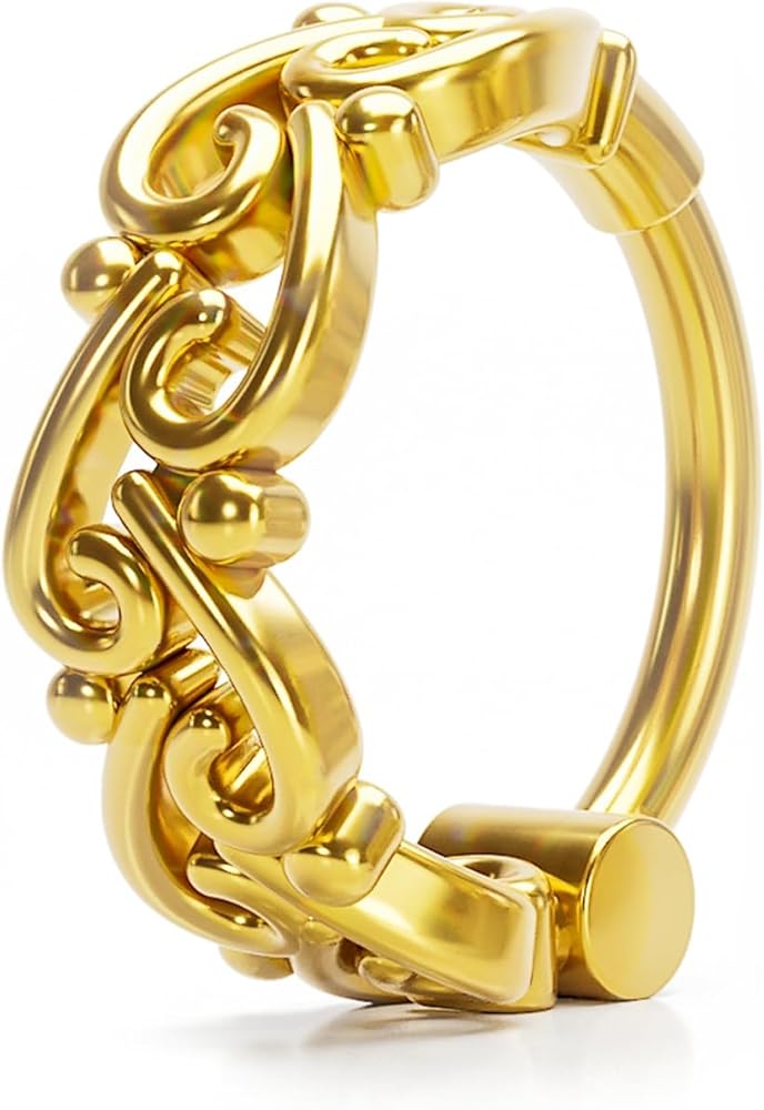 An Indian inspired hoop with a statement tribal design. This hoop earring is perfect for any occasion, from an everyday t-shirt and jeans to a night out in a little black dress. Add this unique nose hoop for a cool stylish look or gift it to someone special. The hoop features a durable clicker mechanism that makes it easy to insert and remove. Our body jewelry collection is crafted from high quality materials and made to fit your personal style. Our clickers hoops are versatile and can be worn in many different piercings.
