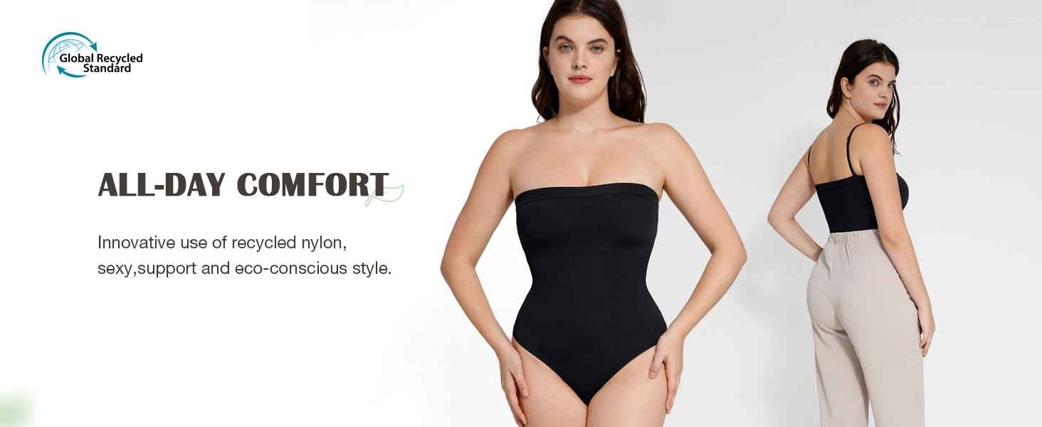 It all starts with our innovative use of recycled nylon, turning waste into elegance. Every strapless thong bodysuit is specially engineered to sculpt, smooth and shape your body's natural contours. Strategic compression gently hugs and firms your figure, while crotch snaps ensure effortless wear. With options for removable straps, you can customize your look for any occasion.