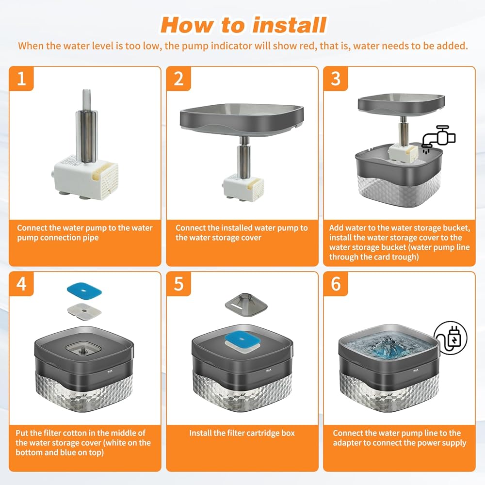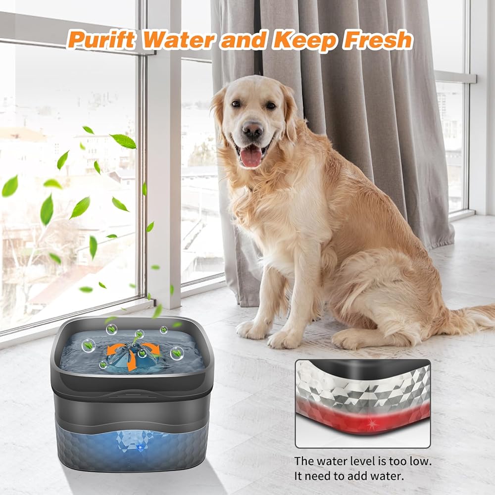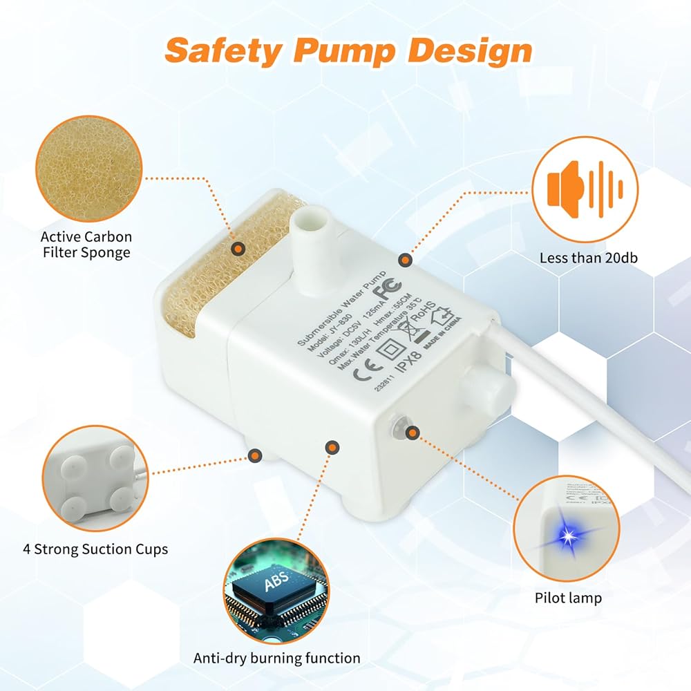 【تصميم مضخة السلامة】نافورة مياه للحيوانات الأليفة مع وظيفة مقاومة للحرق الجاف، لا داعي للقلق لأن الماء ليس كافيًا لحرق آلة الشرب. عندما يكون مستوى الماء منخفضًا، ستظهر المضخة ضوءًا أحمر، حتى تتمكن من رؤية الوقت الذي تحتاج فيه إلى إضافة الماء بالضبط. يبلغ صوت وقت التشغيل 20 ديسيبل فقط، مما يوفر بيئة معيشة هادئة لك ولحيواناتك الأليفة.