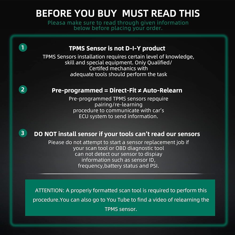 【لا يتطلب برمجة مستشعر 】يأتي نظام مراقبة ضغط الإطارات (TPMS) مبرمجًا مسبقًا خصيصًا لطراز/طراز/سنة سيارتك، فقط تحتاج إلى تنشيطه باستخدام أداة المسح الضوئي.