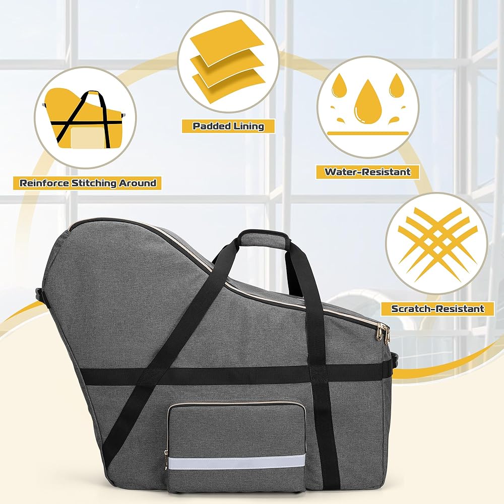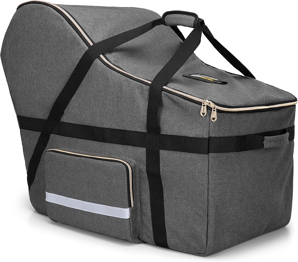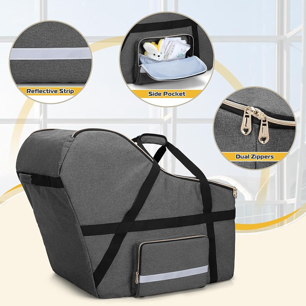 تصميم ذكي: حقيبة سفر بغطاء مقعد السيارة مع 4 وسادات أقدام غير قابلة للانزلاق في الأسفل لتقليل الاحتكاك من الأرض، والحفاظ على الأمان والنظافة، كما أنها ستطيل عمر خدمة حقيبة السفر لمقعد السيارة. جيب شبكي مدمج بالداخل وجيب جانبي واحد للحفاضات أو المناشف أو غيرها من مستلزمات العناية بالطفل. يمكن أن يكون الشريط العاكس الموجود على الغطاء مرئيًا ويحافظ على سلامتك أثناء المشي.