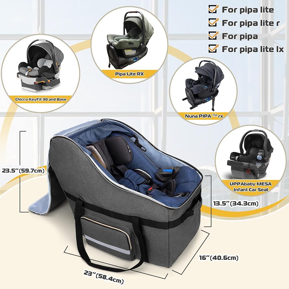 تناسب معظم مقاعد السيارات وقاعدتها: حجم حقيبة مقعد السيارة للرضع من تيموي هو: 23 بوصة × 16 بوصة × 23.5 بوصة، متوافقة مع جميع موديلات مقاعد السيارة بقاعدة من نونا بيبا (متوافقة مع نونا بيبا، بيبا لايت، بيبا لايت آر، pipa lite lx، pipa lite rx، pipa rx)، Chicco KeyFit 30 and Base، وUPPAbaby MESA نصائح مقعد السيارة للرضع: يرجى قياس الحجم قبل الشراء.