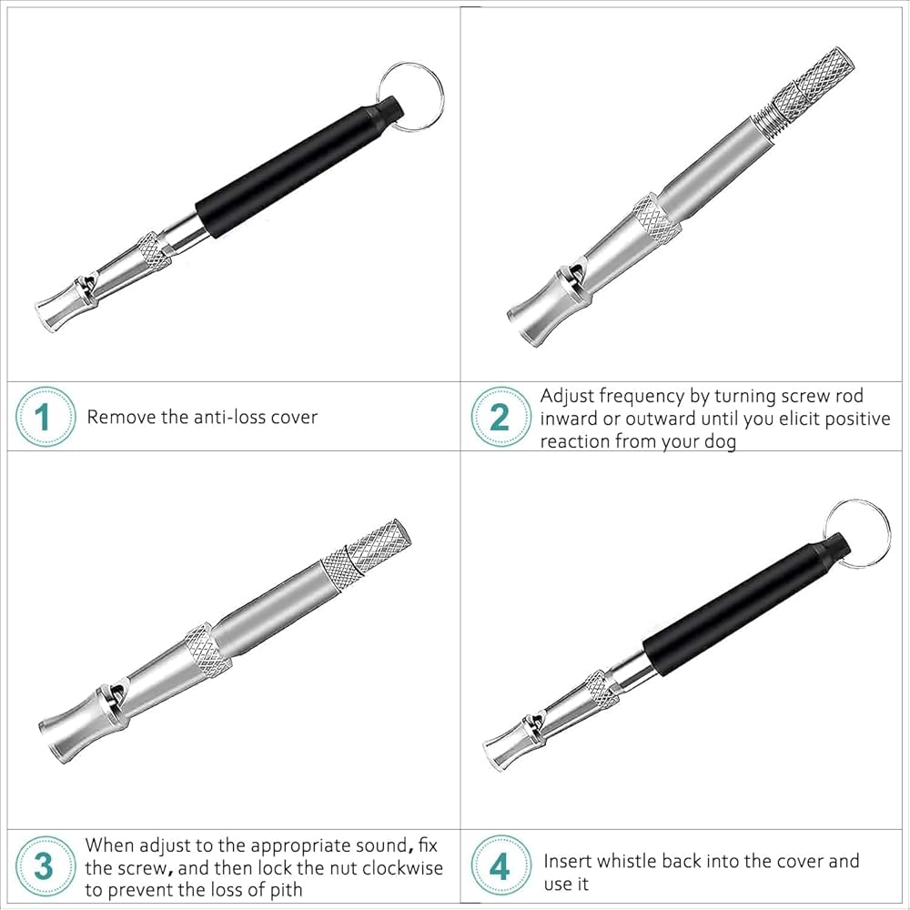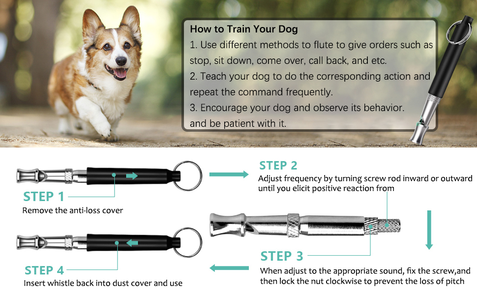 تدريب الكلاب بالموجات فوق الصوتية: يمكنك ضبط درجة الصوت للحصول على الترددات الصحيحة، وفك برغي التعديل الصوتي أثناء نفخ الهواء من مدخل الهواء، وإدارة ذراع التعديل لضبط درجة الصوت المثالية. بعد إدارة ذراع الضبط، قم بربط برغي الضبط الصوتي. هذه صفارة للكلاب تعمل بالموجات فوق الصوتية تتوقف بسرعة عن النباح وتساعدك على تعليم كلبك الطاعة وتعلم المهارات الأساسية، مثل الجلوس، والمخالب، والاستلقاء، والأعلى.