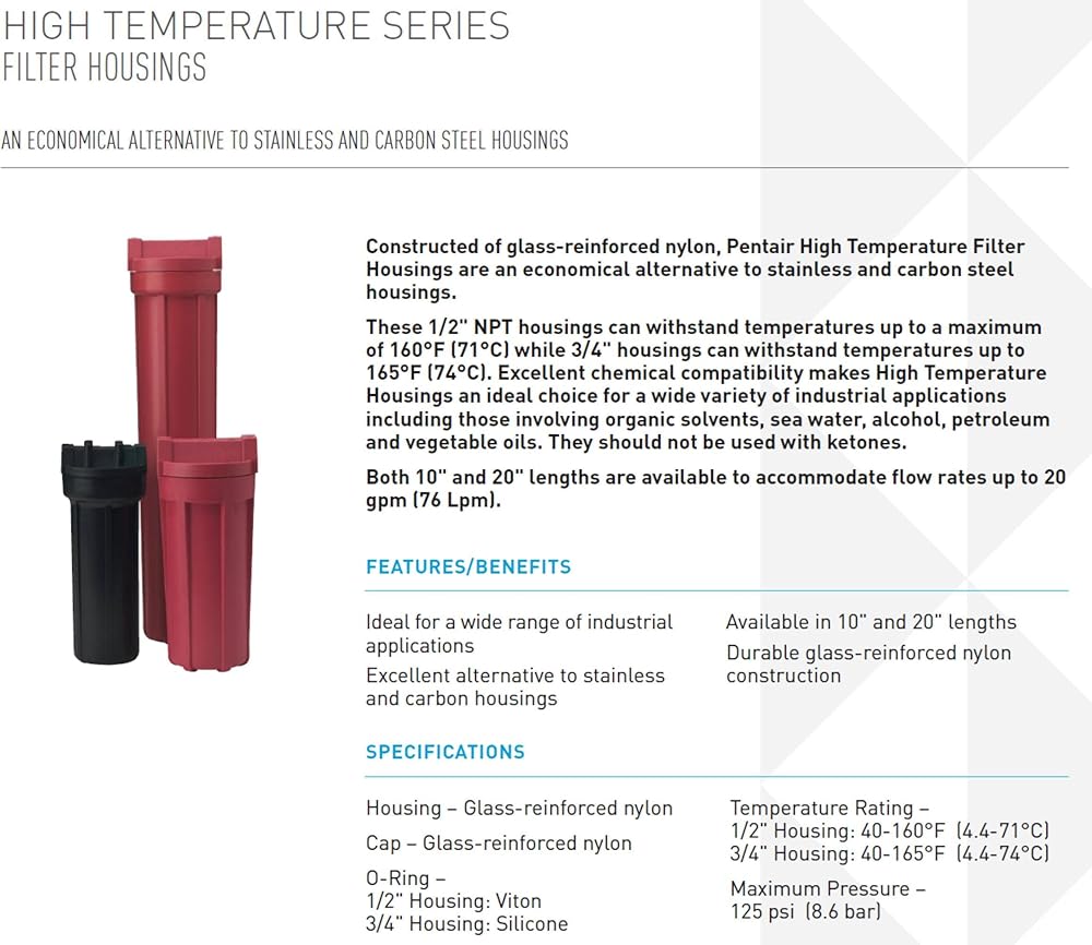 Constructed of glass-reinforced nylon, Pentair High Temperature Filter Housings are an economical alternative to stainless and carbon steel housings. The 1/2" NPT housings can withstand temperatures up to a maximum of 160°F (71°C) while 3/4" housings can withstand temperatures up to 165°F (74°C). Excellent chemical compatibility makes High Temperature Housings an ideal choice for a wide variety of industrial applications including those involving organic solvents, sea water, alcohol, petroleum and vegetable oils. They should not be used with ketones. Both 10" and 20" lengths are available to accommodate flow rates up to 20 gpm (76 Lpm).