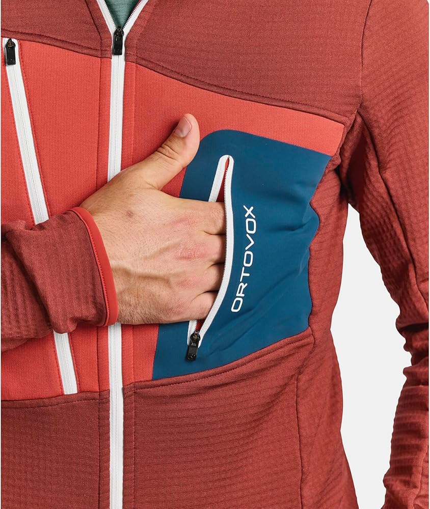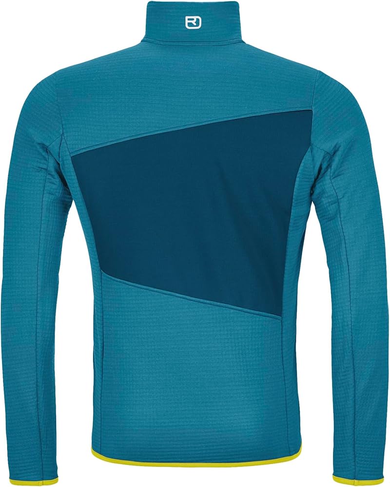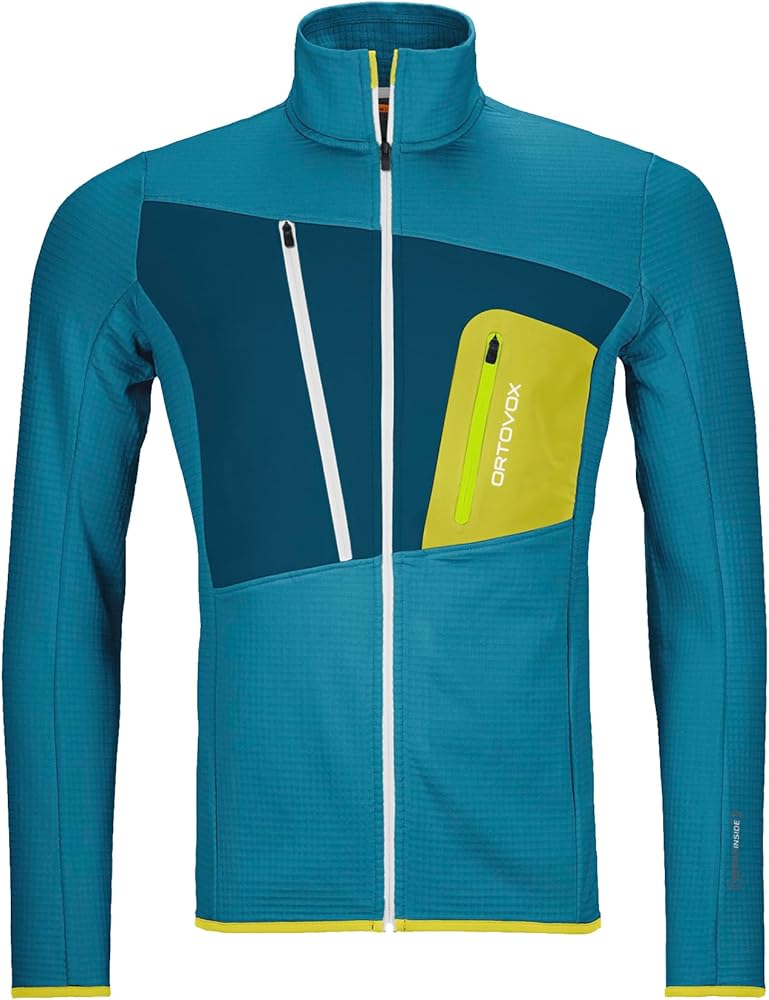 DESIGN: Lightweight men's high alpine fleece jacket featuring a Fleece Light insert in the chest area, high collar, double-layered breast pockets, and excellent stretchability and ventilation. The jacket excels at temperature-regulation properties supported by fine Merino wool on the inside and is ideal for mountaineering, ski touring, freeride, and high alpine climbing. Climate Neutral product.