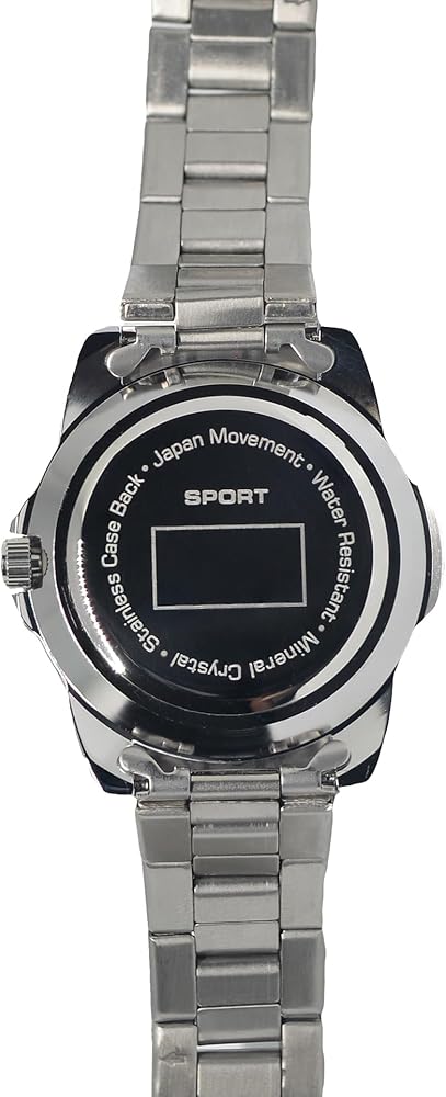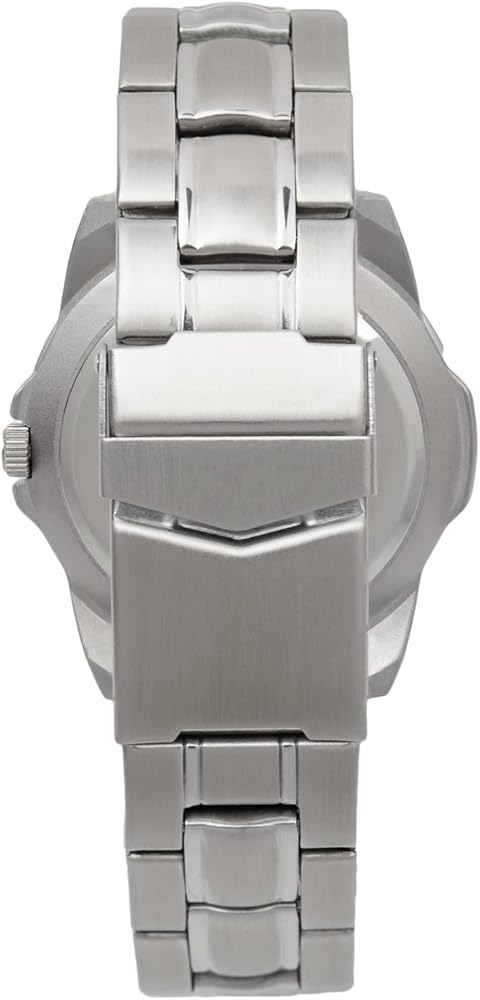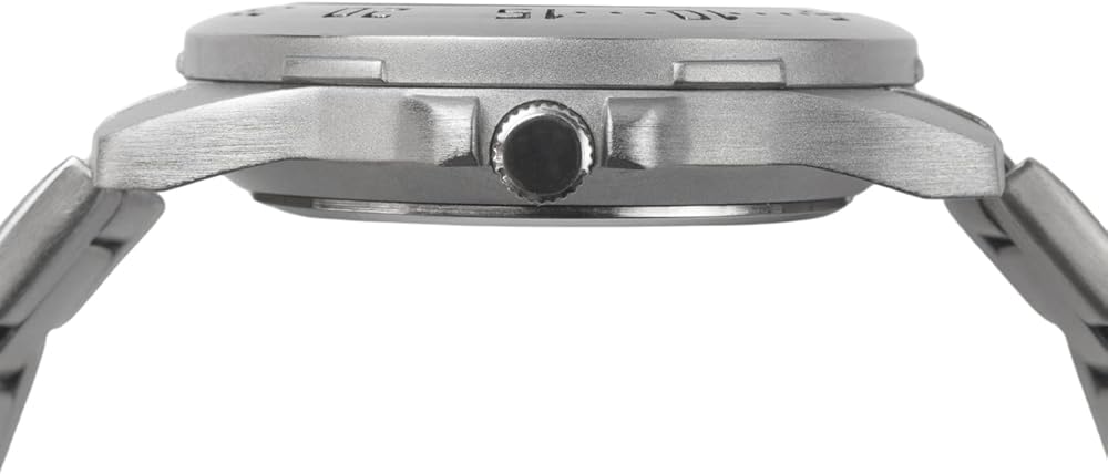 • علبة متينة من خليط معدني مطلي بالأيون مع سوار متصل من الفولاذ المقاوم للصدأ يمكن أن يناسب المعصم حتى 8.5 بوصة - تاج يسهل الوصول إليه لتحديد الوقت/التاريخ.