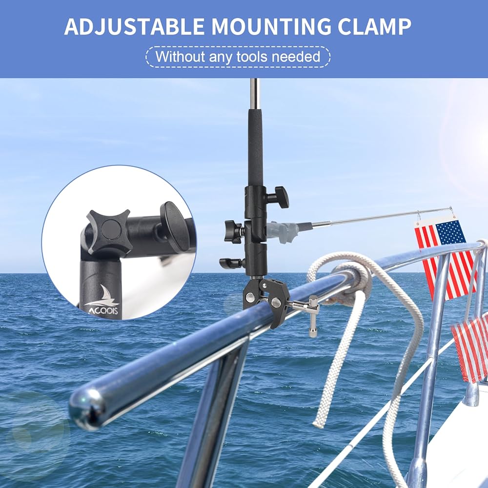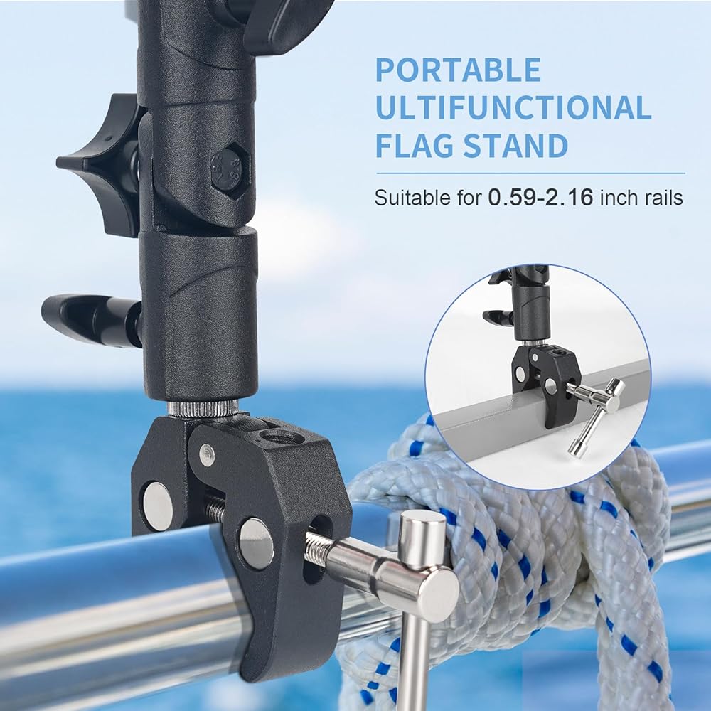 【مشبك تثبيت قابل للتعديل】مجموعة عمود علم القارب مع مشبك تثبيت يدور بزاوية 90 درجة، مما يسمح للسائق أو المنظر بالتحرك السريع لأعلى وأسفل. أدر المقبض لإحكام تثبيته في مكانه، ويتأرجح مشبك التثبيت لأعلى ولأسفل بسهولة، ويحتوي مشبك التثبيت على حصيرة مطاطية مضادة للانزلاق لن تخدش الدرابزين. يناسب الدرابزين الدائري والعائم المربع من 0.59 إلى 2 بوصة.