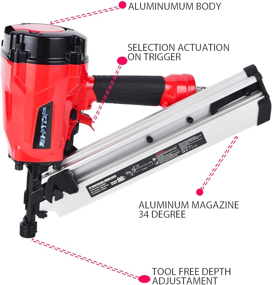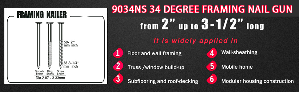 تستخدم على نطاق واسع: من أجل 34 درجة 2 بوصة إلى 3-1/4 بوصة (50-83 مم) مسامير تأطير بلاستيكية مجمعة. عمق تعديل محرك الأقراص بدون أدوات لتحسين التحكم والمرونة عند التثبيت في أنواع مختلفة من الخشب. إنها مثالية للتأطير وتغليف الجدران وتركيب الجوانب وبناء المنصات وتجميع المنتجات الخشبية والسياج وما إلى ذلك.
