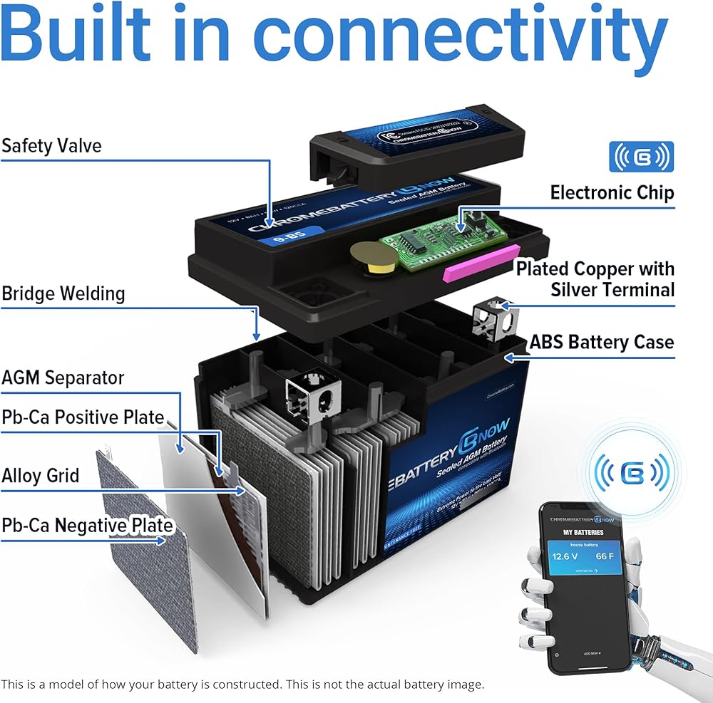 The Chrome Battery Now Wireless Smartphone Connectivity batteries allow you to stay connected with your battery at all times and monitor performance on your phone. Wirelessly connects to the app using RF, increasing the reliability and accessibility for users; Apple and Android connectivity. This new technology in the power sports battery category provides an integrated wirelessly connected circuit board that allows temperature and charge monitoring. No need to dissasemble battery in order to check voltage or temperature. Just open the app when you are within range and it will connect to your battery and display the updated voltage and temperature. Recieve alerts if your battery has high or low voltage as well as a monthly report to inform you how your battery performed that month. Constructed with lead calcium alloy and absorbed glass mat technology that allows for a completely maintenance-free and high-performance operation; rigorously tested to ensure safety, OEM compatibility, effectiveness and optimal performance.