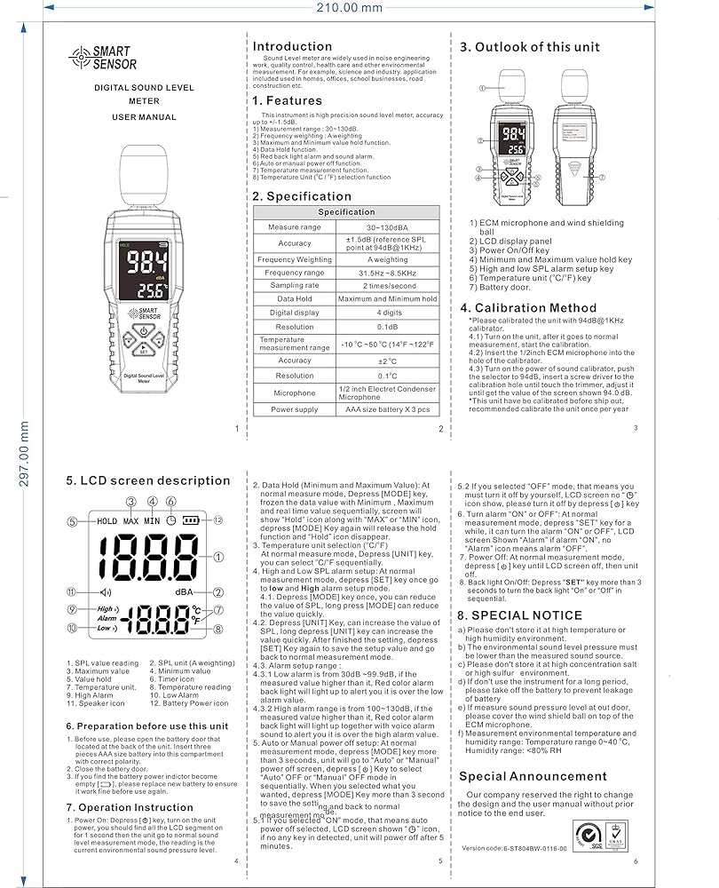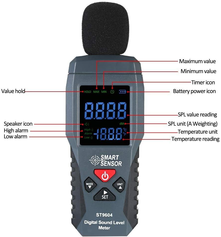 This noise meter is designed to test sound level in various environment. It is widely used in noise control engineering, quality control, health and treatment, home environment monitoring, etc.