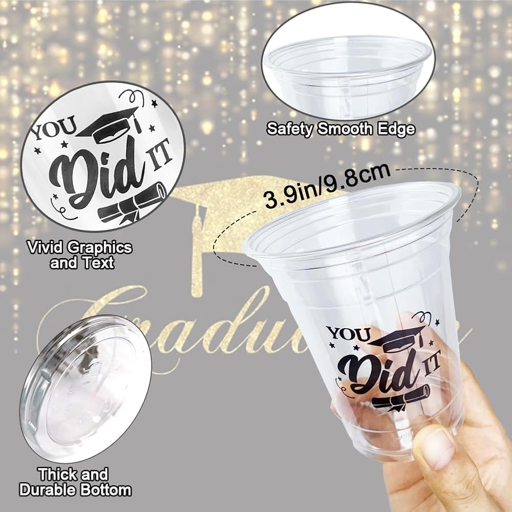 جودة فاخرة - أكواب التخرج مصنوعة من بلاستيك PET الموثوق به، شفافة وقوية بدون رائحة، وليس من السهل أن تتشقق أو تتسرب، وفم الكوب ناعم ومريح وآمن للشرب.