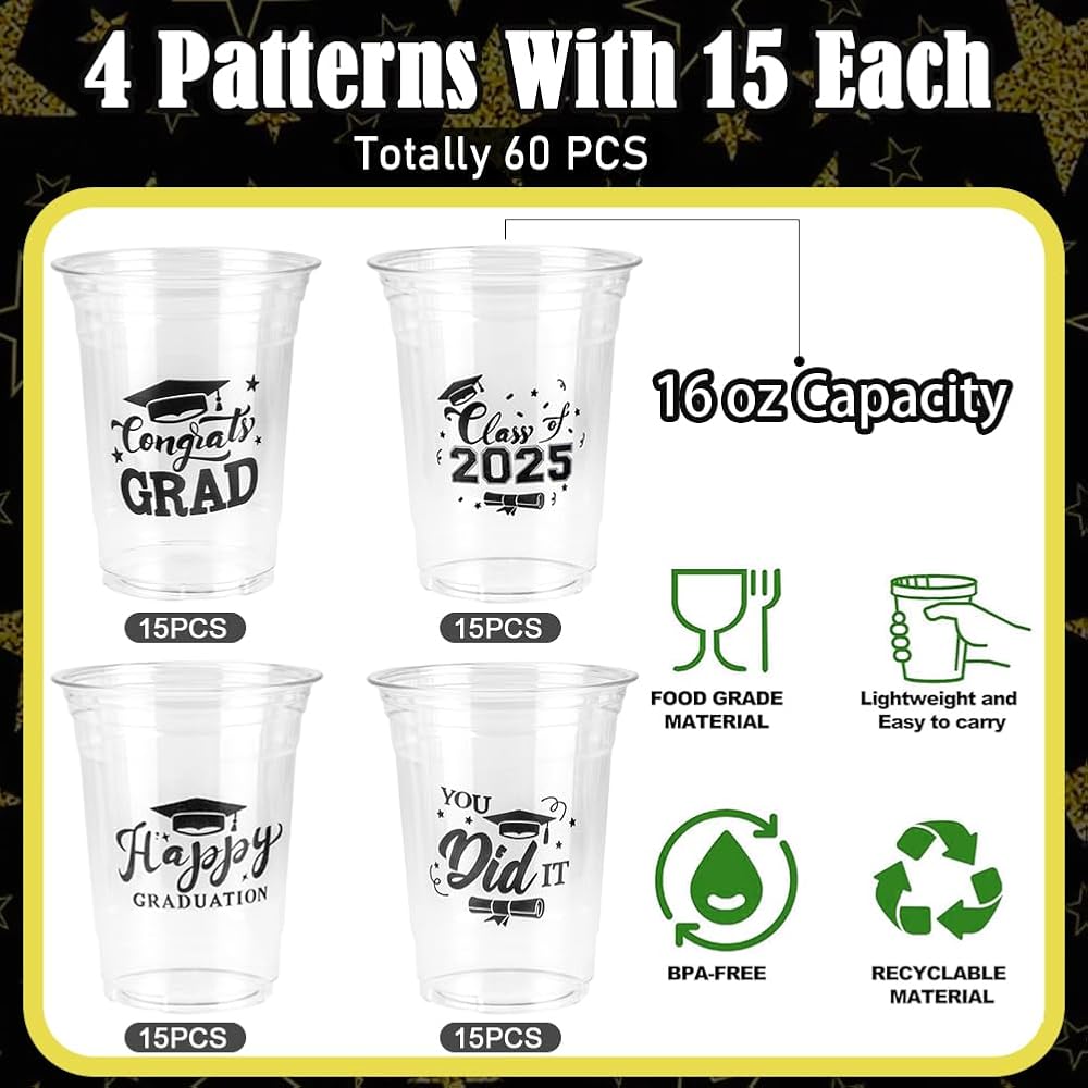 مجموعة أكواب التخرج - سوف تحصل على 60 قطعة من أكواب التخرج البلاستيكية بوزن 16 أونصة لتلبية مستلزمات حفلات التخرج الخاصة بك. أكواب التخرج هذه التي تستخدم لمرة واحدة مناسبة لحمل القهوة والشاي والمشروبات المثلجة والمزيد.