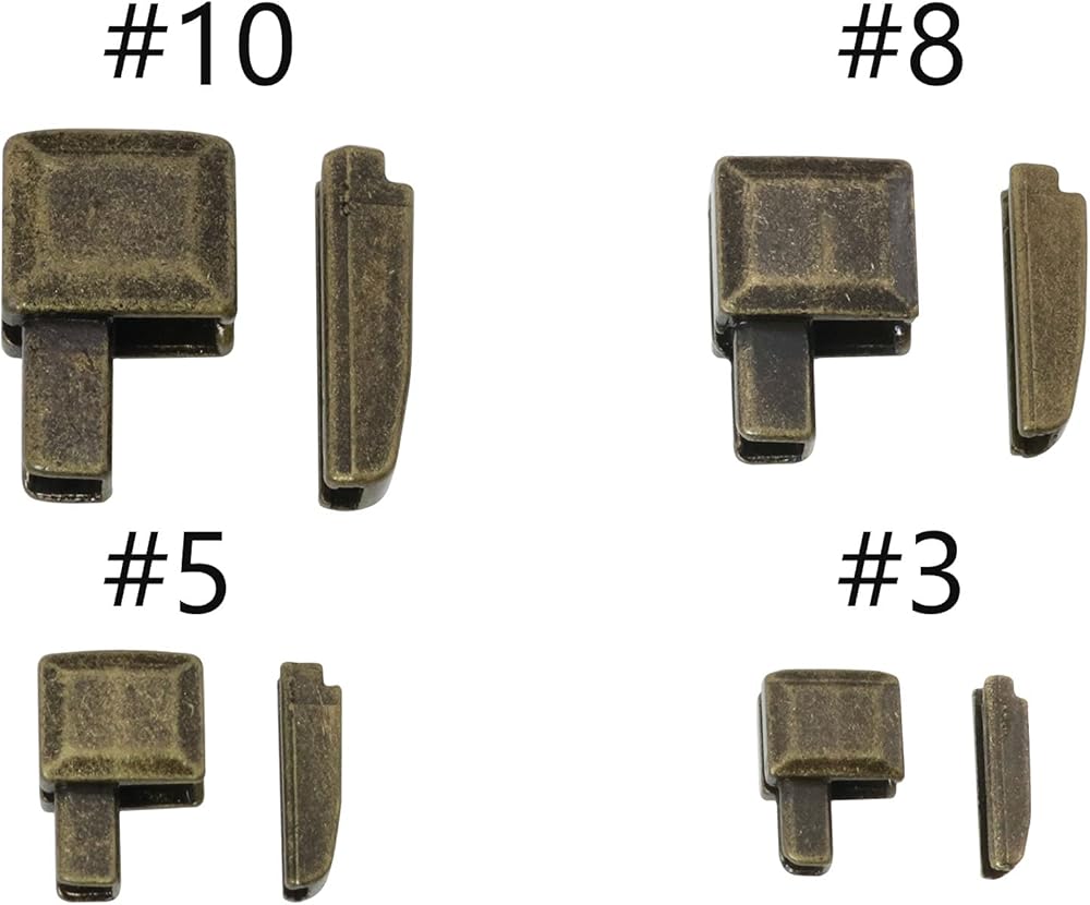 Specification Product name: Bronze zipper latch Material: Zinc Alloy Model: No. 3, No. 5, No. 8, No. 10 Uses: suitable for luggage, clothing, home textiles, apparel, footwear, etc. Weight: No. 3: 0.5g/set No. 5: 1g/set No. 8: 2.1g/set No. 10: 3.2g/set Note: The slider is not universal, and different zippers correspond to different sliders. No. 3 corresponds to the combined width of 4-4.6mm zipper teeth. No. 5 corresponds to the combined width of 5.5-6.31mm zipper teeth. No. 8 corresponds to the combined width of 7.2-8mm zipper teeth. No. 10 corresponds to the combined width of 8.5-9mm zipper teeth.