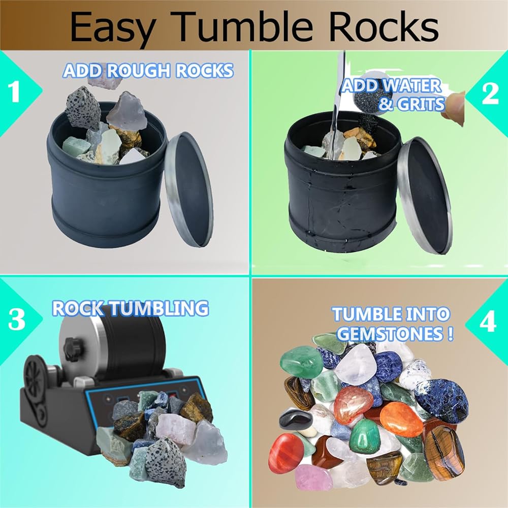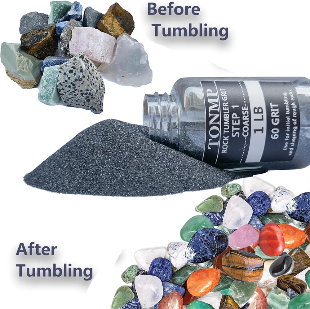 【4 Steps】Be Patient. There are 4 total cycles, 7 days each to have pretty rocks / gems. Step 1, 60 Coarse Silicon Carbide Grit. Step 2, 220 Medium Silicon Carbide Grit. Step 3, 500 Fine Silicone Carbide Grit. Step 4, 1200 Aluminum Oxide Grit. Just measure in the grit, add enough water to cover the stones, seal the barrel, and tumble. The only variable is how much of the product to use in your rock tumbler. We suggest 2 tbsp of grit per pound of stones, which is a good rule of thumb.
