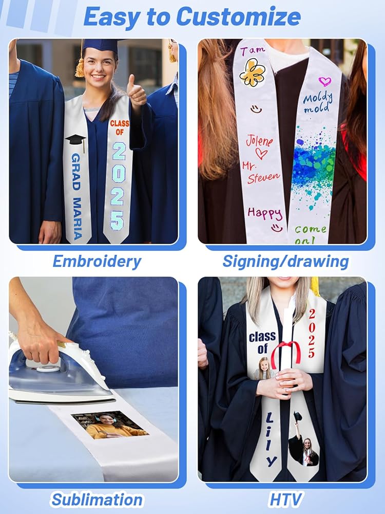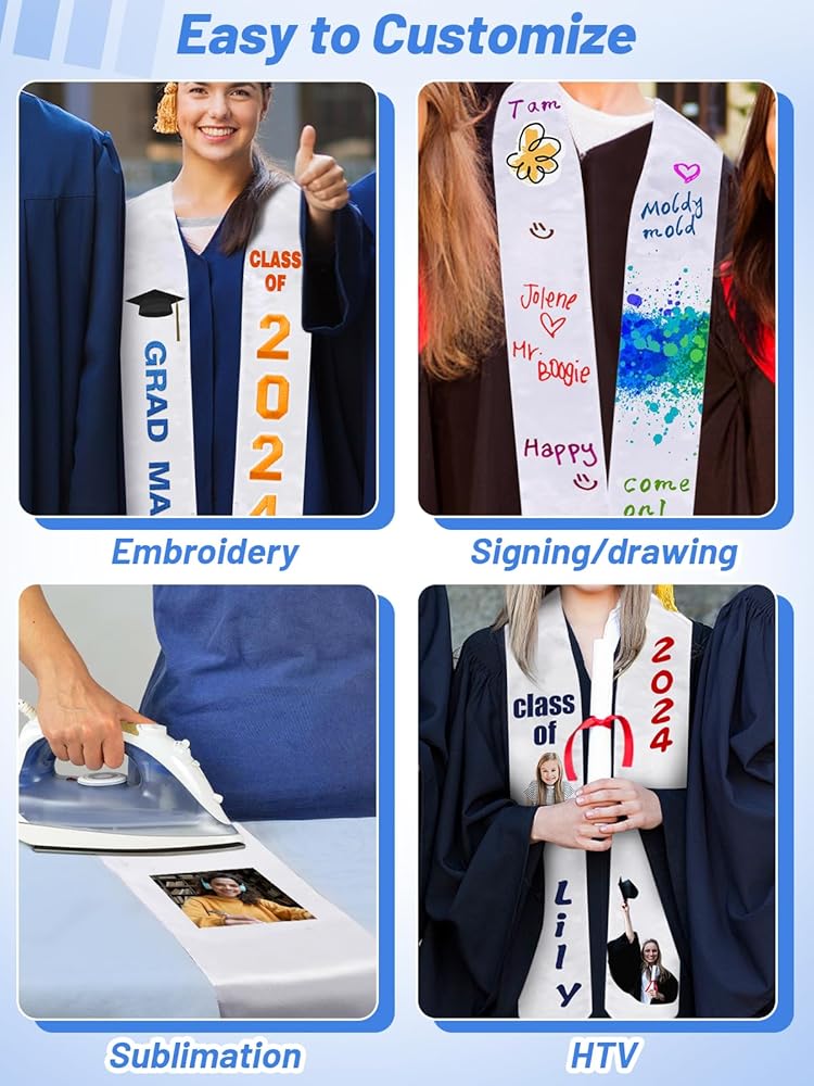 Customizable Options: With various DIY methods like signing, painting, embroidery, HTV, or sublimation, our sash allows you to personalize the stoles for graduation 2024 effortlessly, adding a unique touch to their look.