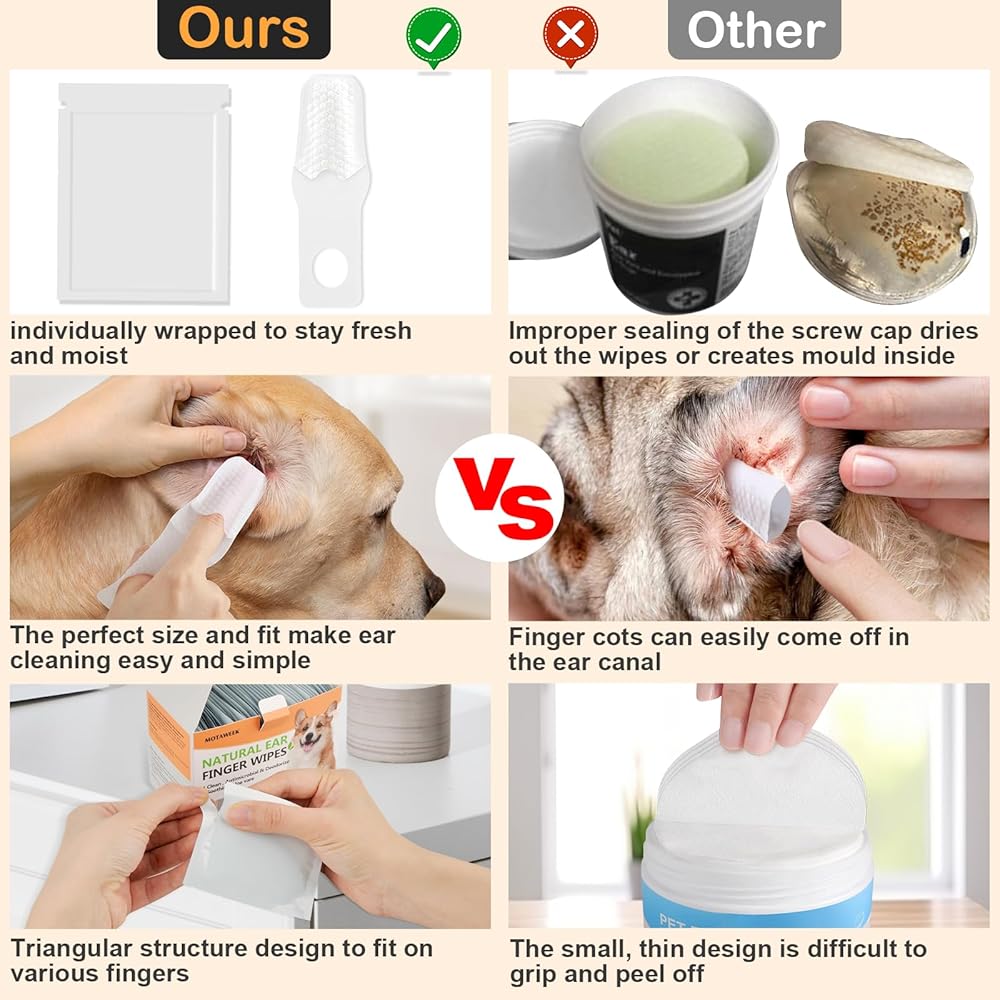 【تزيل الروائح الكريهة وتلطف】يمكن وضع مناديل أذن الحيوانات الأليفة على شكل إصبع للكلاب ببساطة على إصبع السبابة ومسح أي مناطق يصعب الوصول إليها من الأذنين المرنة. على عكس المناديل المبللة المستديرة الصغيرة أو الكرات القطنية، لا داعي للقلق من انزلاق المقبض في قناة أذن الحيوان الأليف. يعزز السطح المحكم النظافة لإزالة الأوساخ بشكل أفضل. هذه المناديل المبللة لتنظيف أذن الكلاب لطيفة ولا تسبب أي حرق أو لسعة وهي مثالية للبشرة الرقيقة والحساسة.