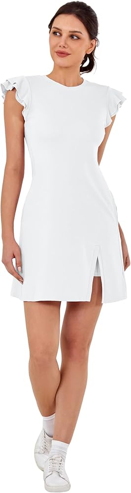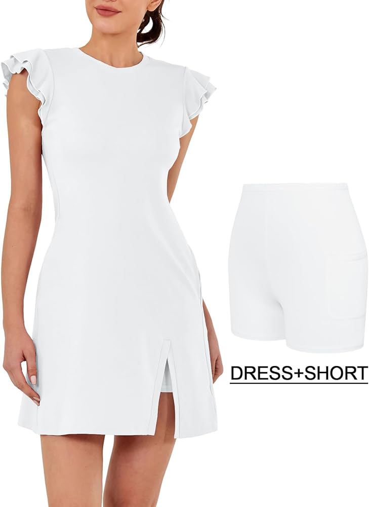 • السمات - تتضمن تفاصيل التصميم تصميم أكمام مزدوجة الكشكشة، ورقبة دائرية، وعلامة رقبة خالية من العلامات، وحاشية مشقوقة. فستان تنس عالي التمدد مع شورت منفصل يجعل من السهل استخدام الحمام.