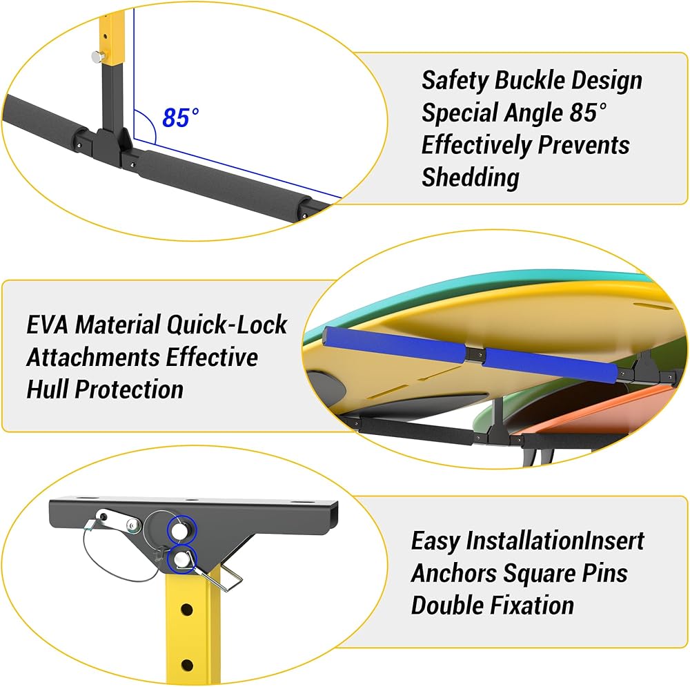 هيكل فولاذي متين: تعرض شماعة رف تخزين الكاياك الخاصة بنا أذرعًا فولاذية قوية مصممة لحماية قوارب الكاياك والألواح وما إلى ذلك. مصحوبة بإطار فولاذي قوي وأذرع صلبة بزاوية 85 درجة. يضمن هذا التكوين الدعم الأمثل ويمنع الترهل.