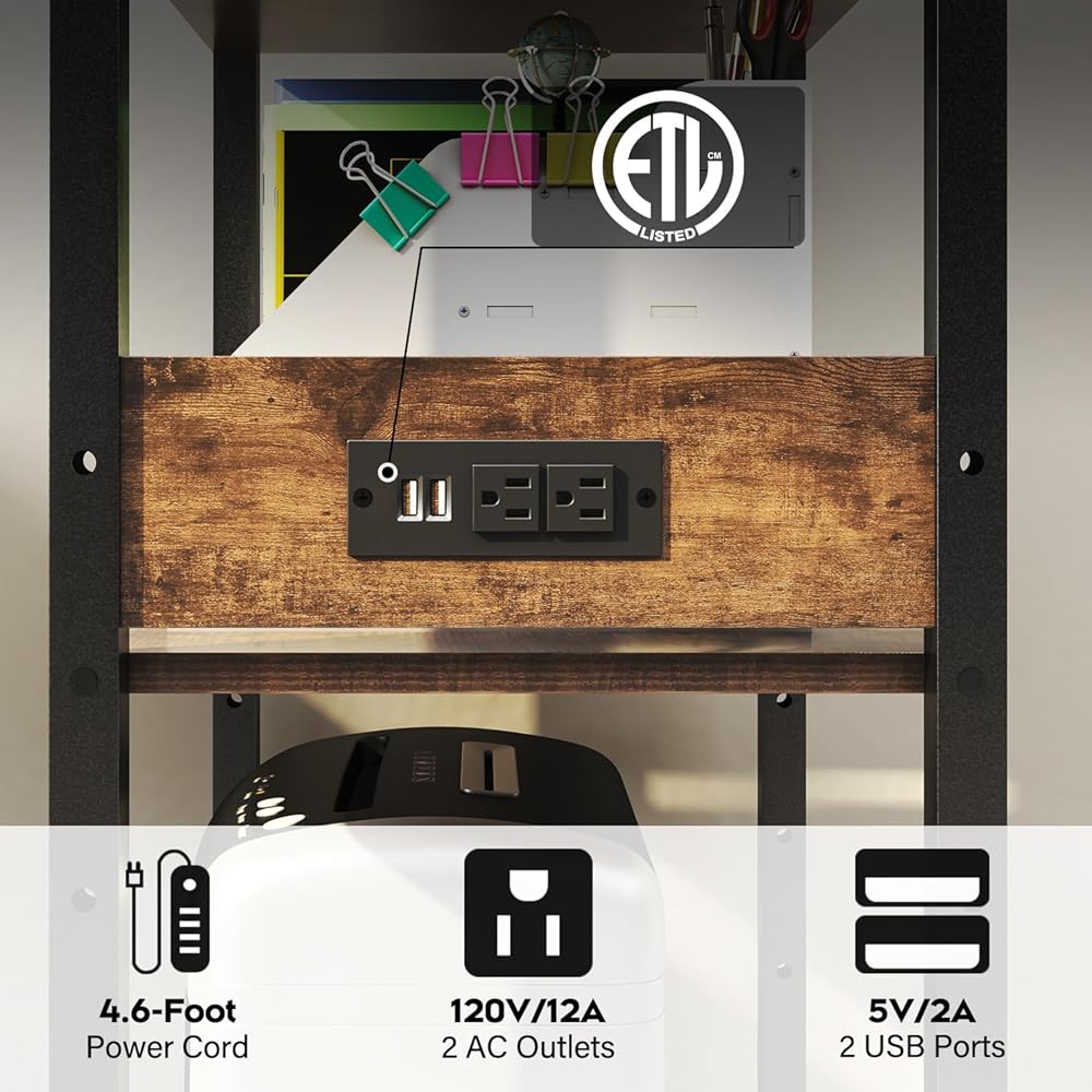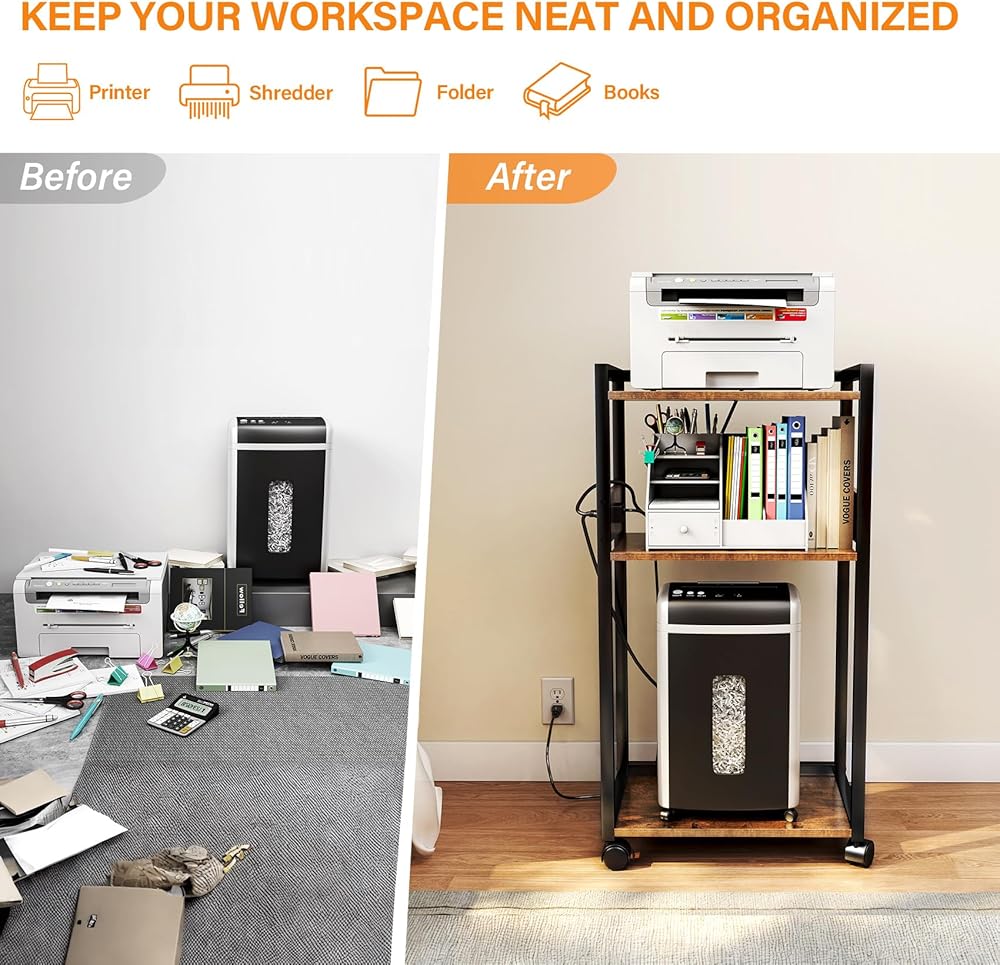 تصميم هيكل متعدد الطبقات: يتميز حامل الطابعة هذا بثلاث طبقات. ضع أجهزة الفاكس والطابعات وآلات تمزيق الورق والماسحات الضوئية في المستويين السفليين. الطبقة العليا تستوعب القرطاسية الصغيرة والنباتات في الأصيص. يضمن التباعد القابل للتعديل بين الطبقات سهولة الحمل والقدرة على التكيف. ويتضمن مقبسًا مدمجًا (2 منافذ تيار متردد، 2 منافذ USB).