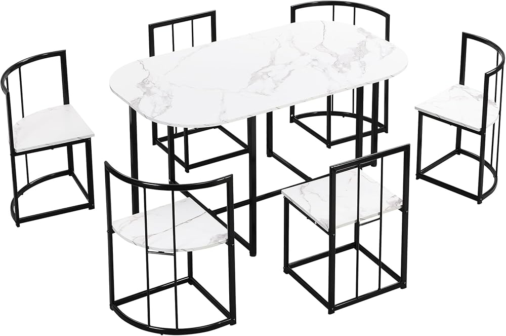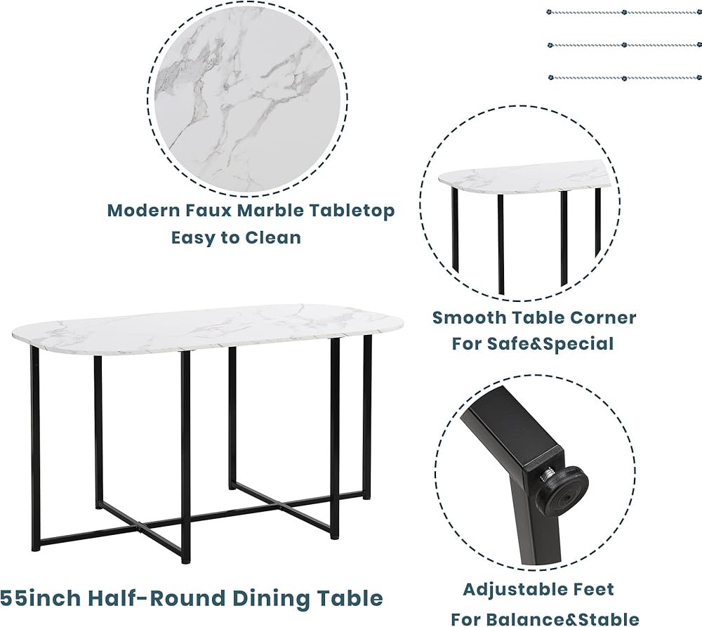 💕💕[Modern Dining Set for 6] This stunning 7-piece dining set boasts a combination of sleek design and functionality. It features six comfortably chairs perfectly matched with a 55-inch table that sport a unique semi-circular shape. The streamline tabletop and chair tops add a touch of opulence to any dining space while being effortless to maintain. Don't miss out on the opportunity to elevate your dining experience with this sophisticated and practical dining set.