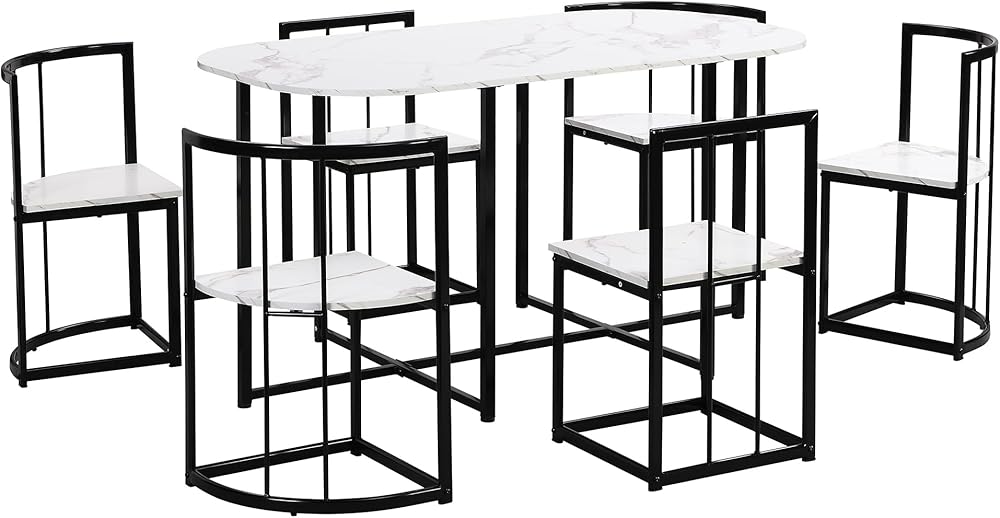 💕💕[Stable&Durable Table Set] This 7-piece dining set is built to last with a sturdy iron frame and MDF tabletop and chair surfaces. The set also features adjustable feet for added stability and can support up to 200lbs on the table and 330lbs on each chair. Enjoy a durable and practical addition to your home with this versatile dining set.